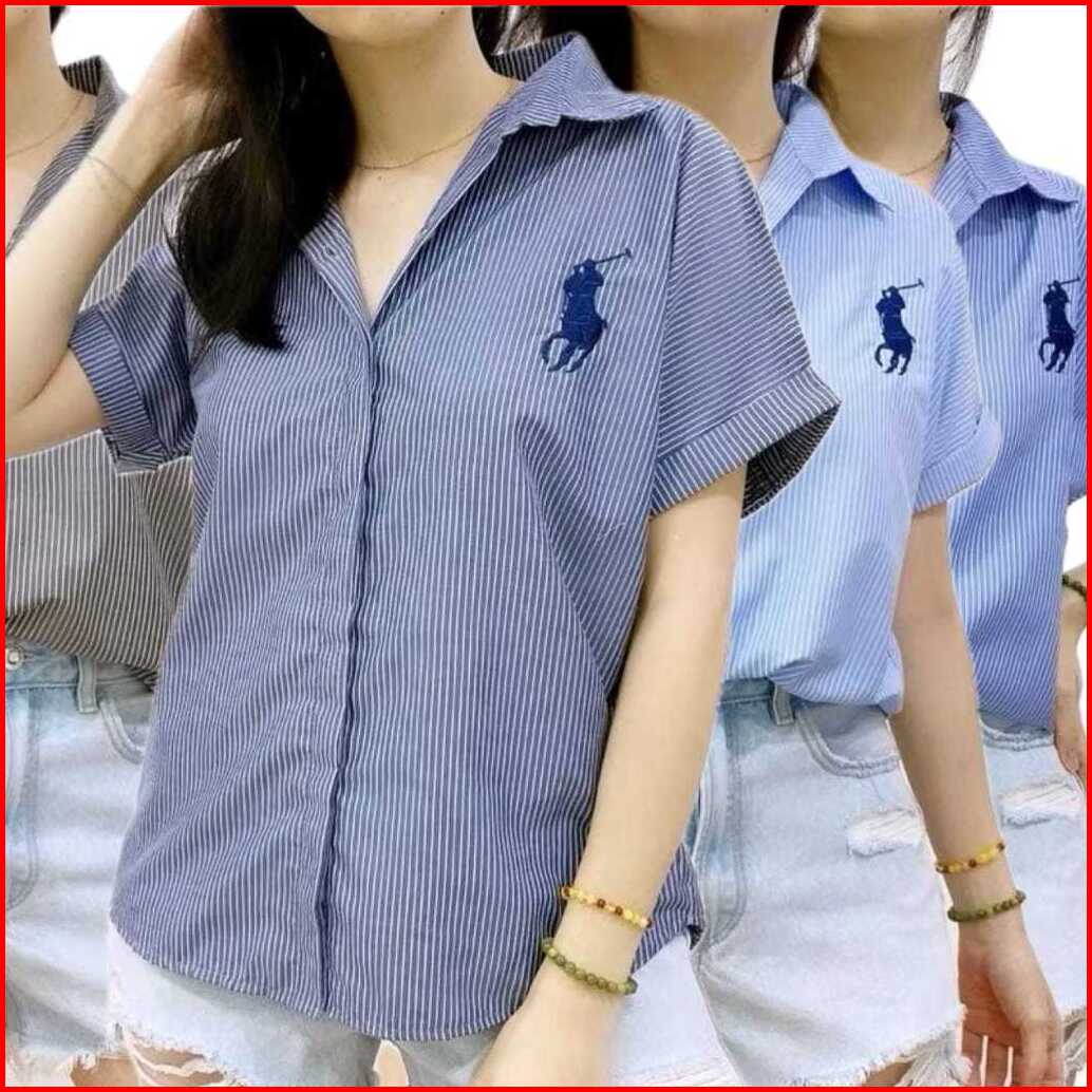 Atasan Kemeja Wanita Pendek Strip Salur Shirt Bordir Polo
