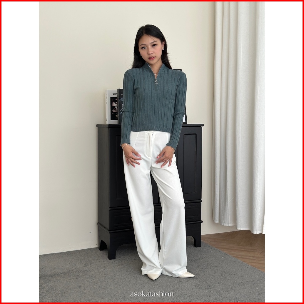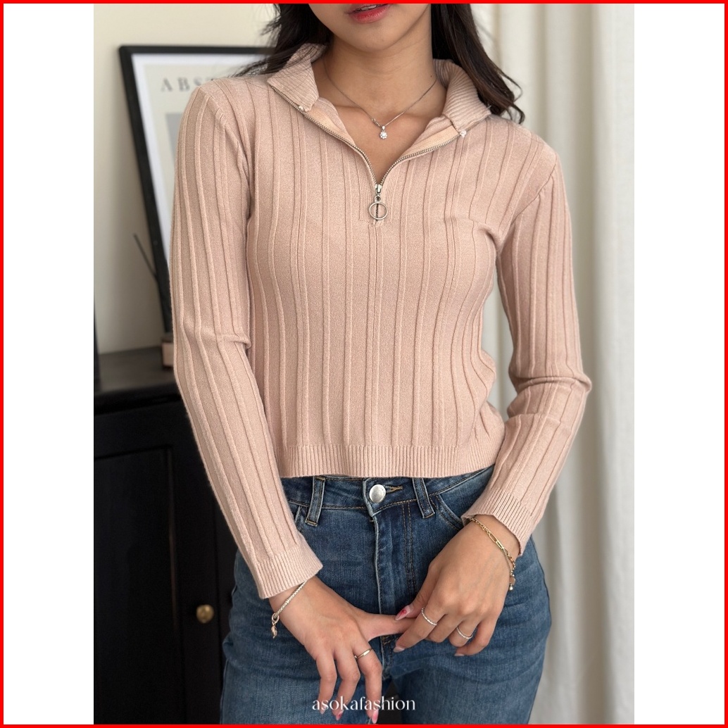 Asoka Avery Top 3144 - Half Zip Knit Crop Long Sleeve V Neck - Atasan Wanita Casual