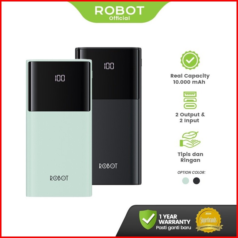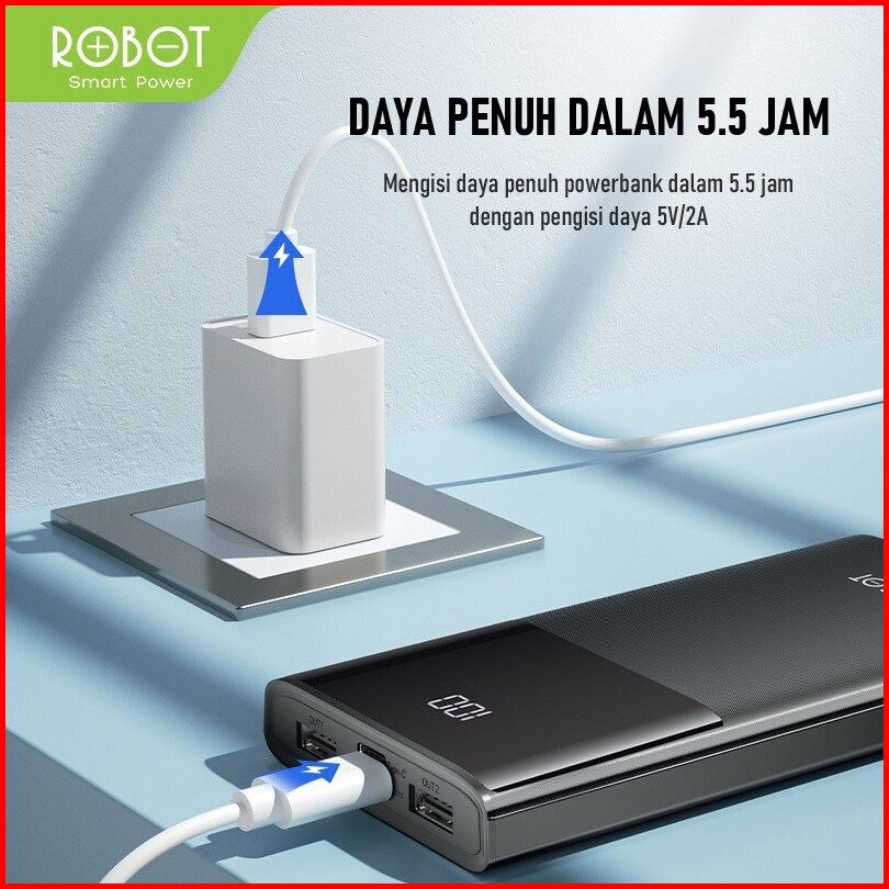 Robot Powerbank 10000mah Real Capacity Dual Input Type C Micro Dual Output Usb Led Display Fast Charging Slim Ringan Por