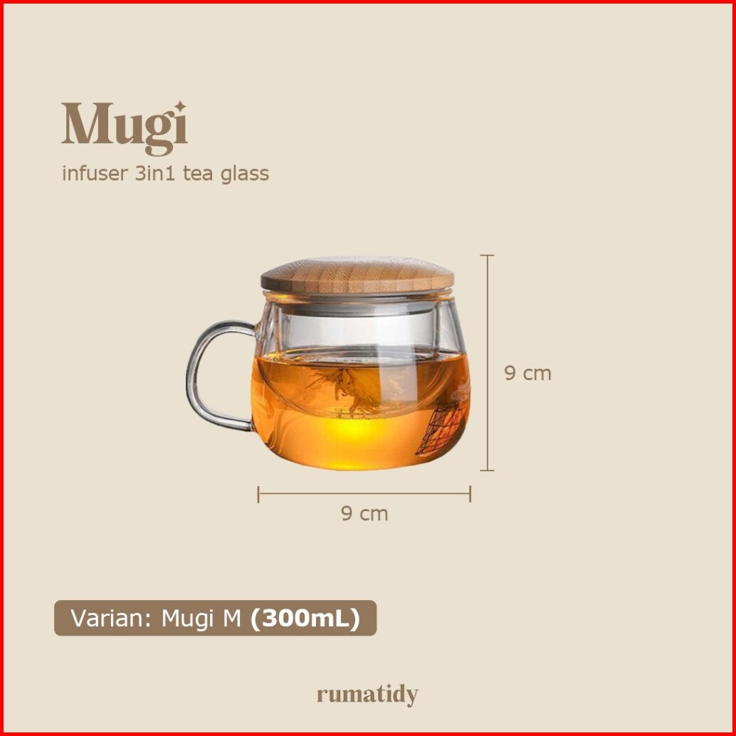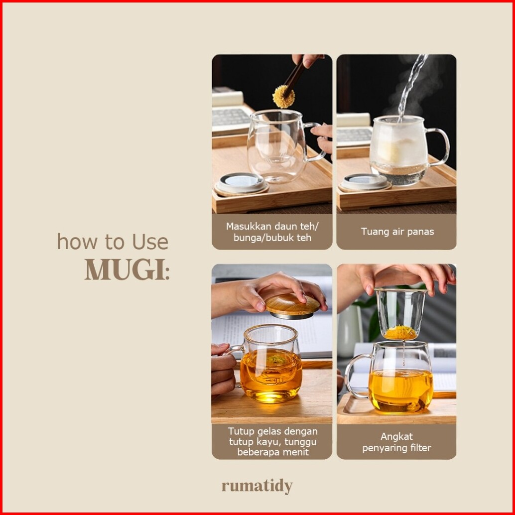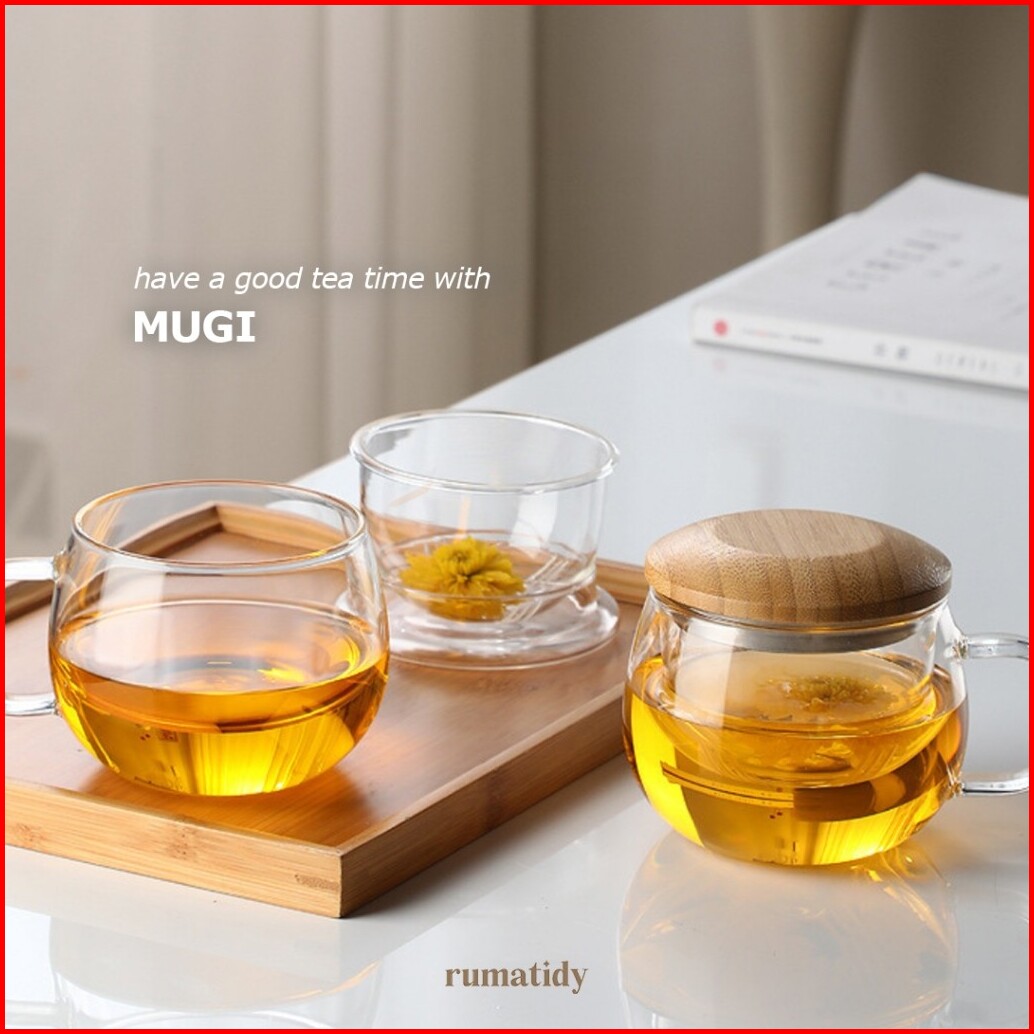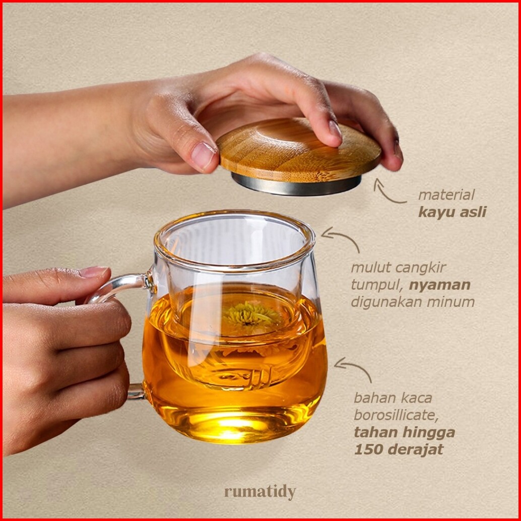 Rumatidymugi Gelas Teh Kaca 3in1 Dengan Tutup Bambu Kayu Dan Saringan 300ml 420ml