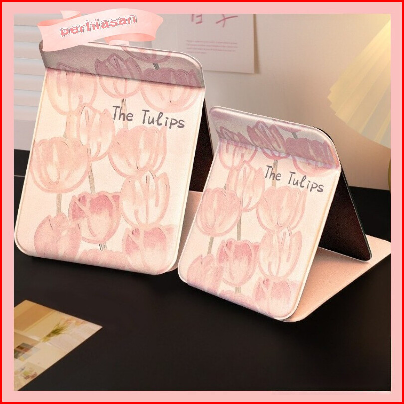 Portable Cermin Rias Lipat Ultra-clear Portabel Cermin Lipat Motive Gambar Kartun Bunga Tulip Cermin Kaca Rias Mike Up D