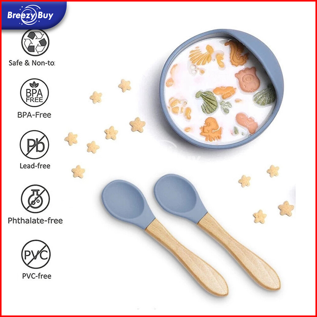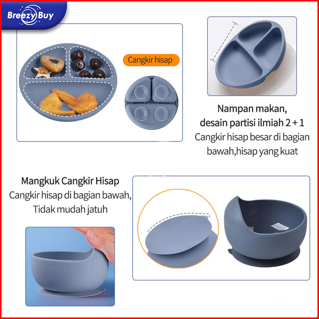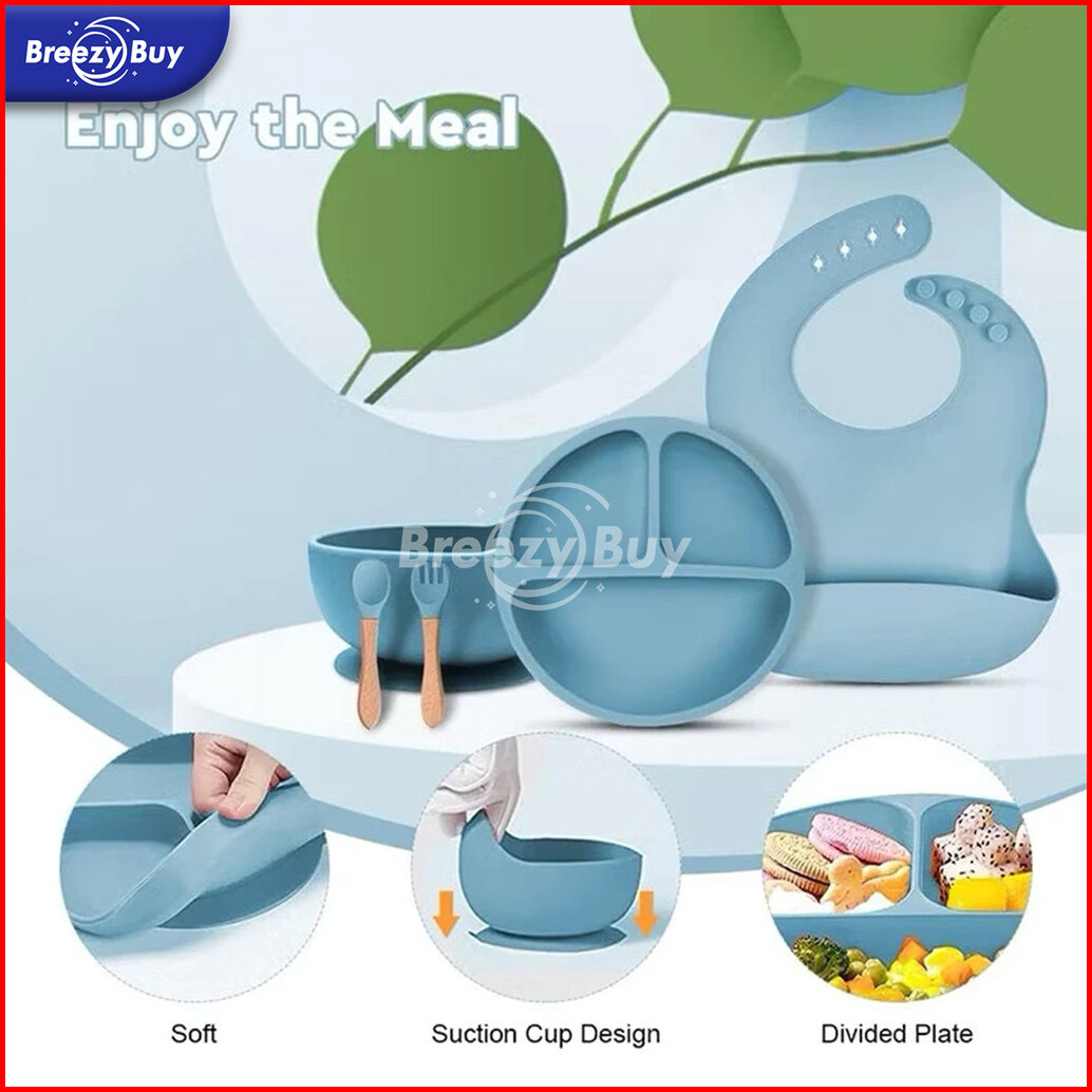 -set Peralatan Makan Bayi 6pcs Silicone Food Grade - Piring Mangkok Lengket Sendok Garpu Celemek Untuk Latihan Makan Man