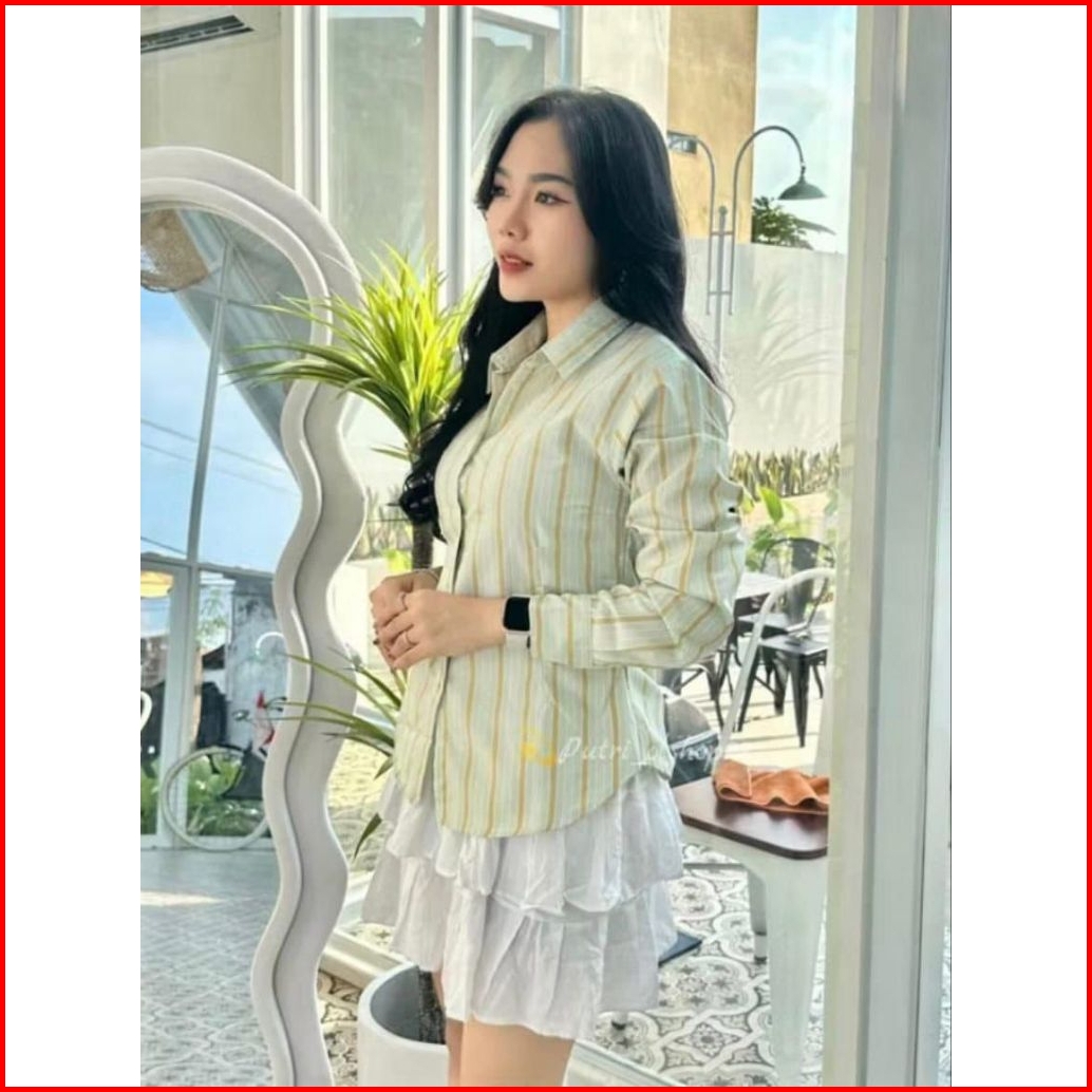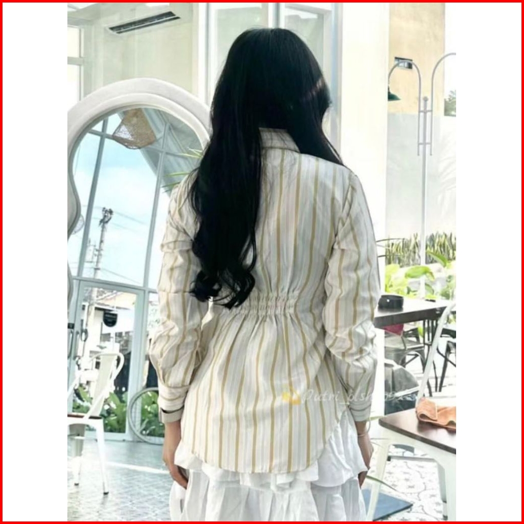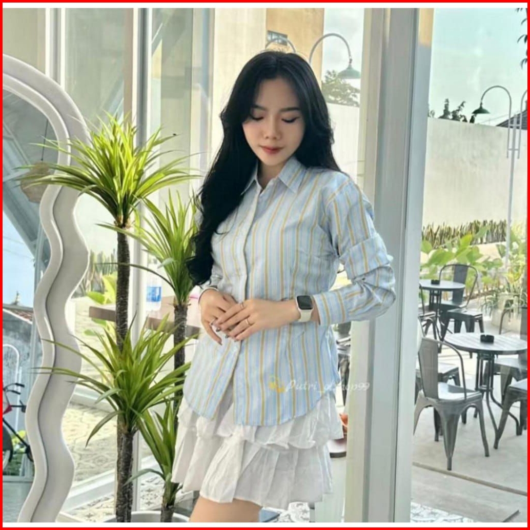Kemeja Wanita Lengan Panjang Fit Body Salur Motif Garis Kemeja Kerja Wanita Atasan Stripe Basic