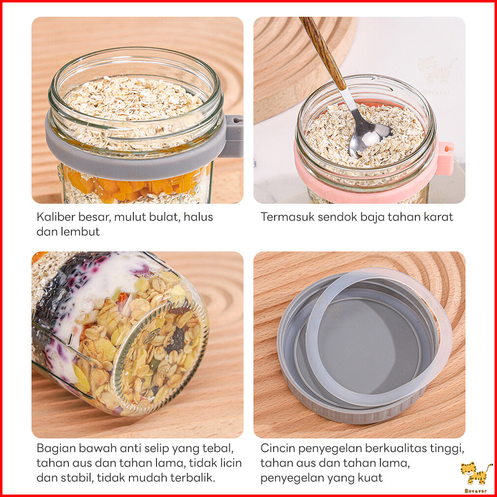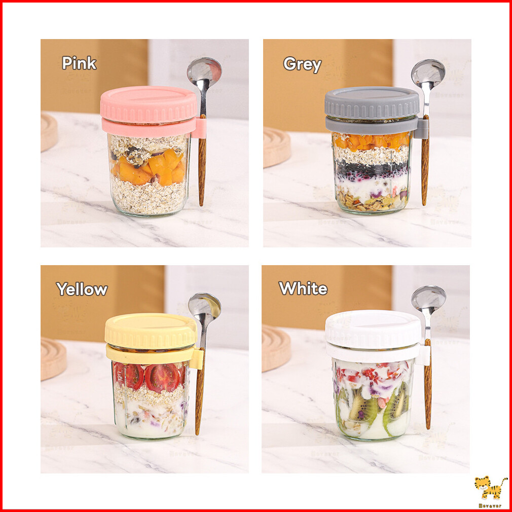 Id Bevavar Tempat Sarapan Gelas Kaca 350ml Dengan Sendok Stainless Gelas Kaca Oatmeal