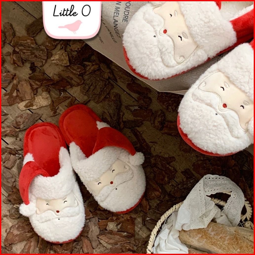 Little O Sendal Bulu Couple Christmas Bahan Empuk Karakter Santa Sandal Bulu Lucu Korea Sandal Kamar Anti Slip Sandal Sl