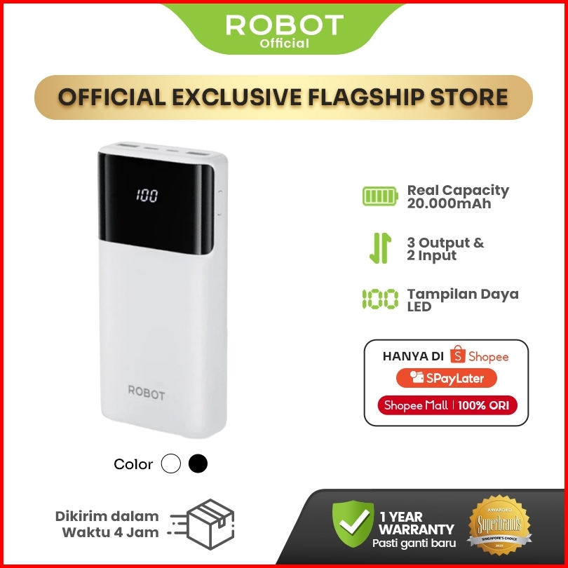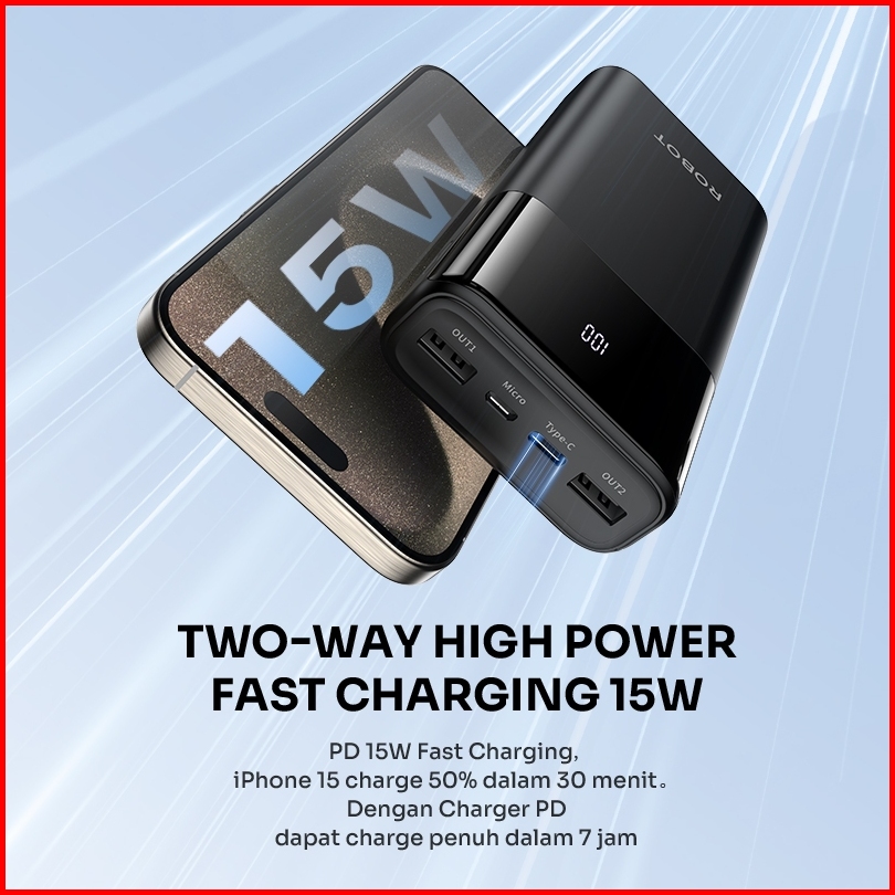 Robot Powerbank Fast Charging 20000mah 15w 2 Input 3 Output With Led Rt22s Original - Garansi 1 Tahun