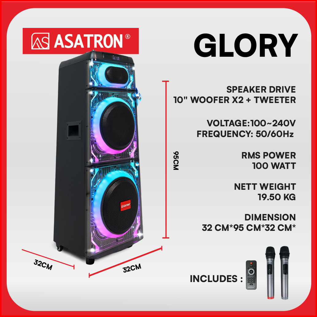 Asatron Glory Dual 10 Inch Bluetooth Party Speaker With 2 Wireless Mic Tws