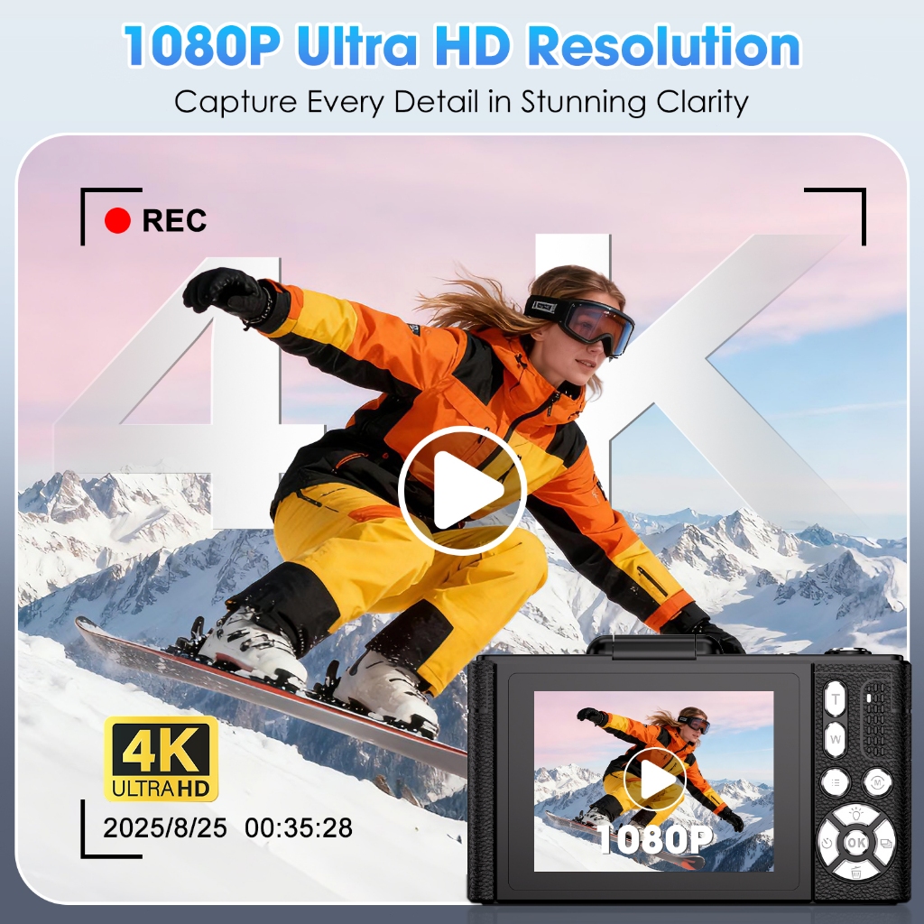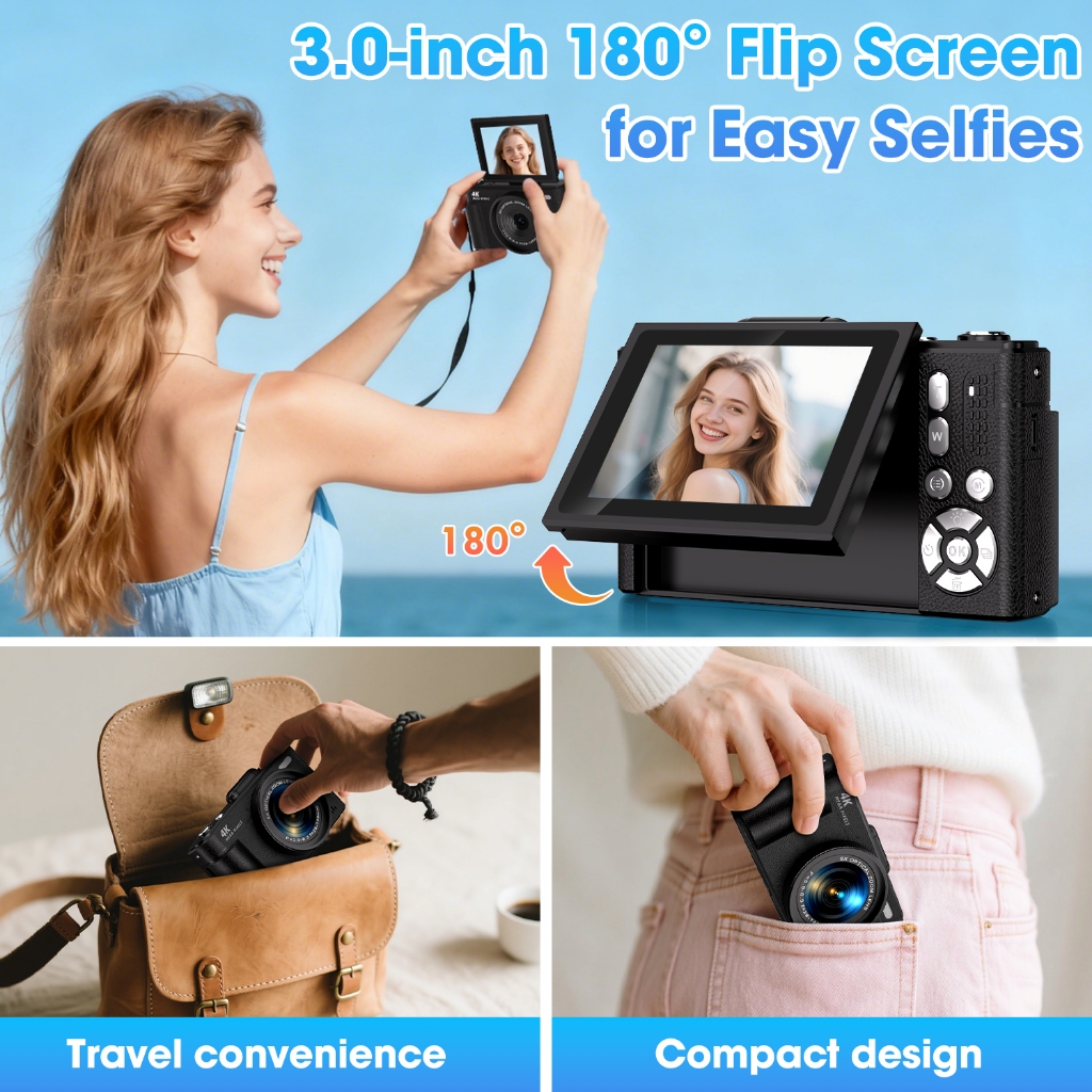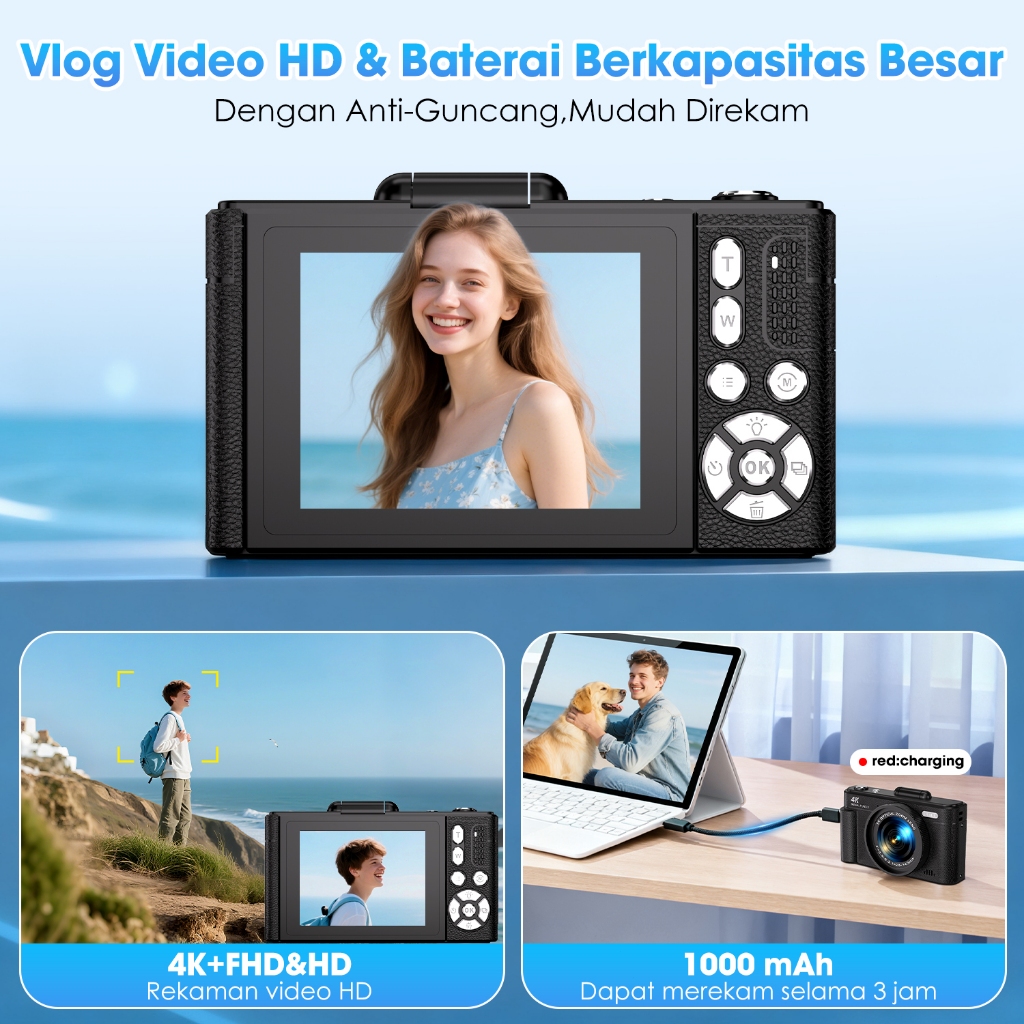 T-JERZEN Kamera Digital 4K untuk Fotografi 64MP Layar Putar Ideal untuk Vlog YouTube & Selfie Dilengkapi Lampu LED Memori 32GB Desain Ringkas untuk Travel Cocok untuk Remaja dan Pemula V5