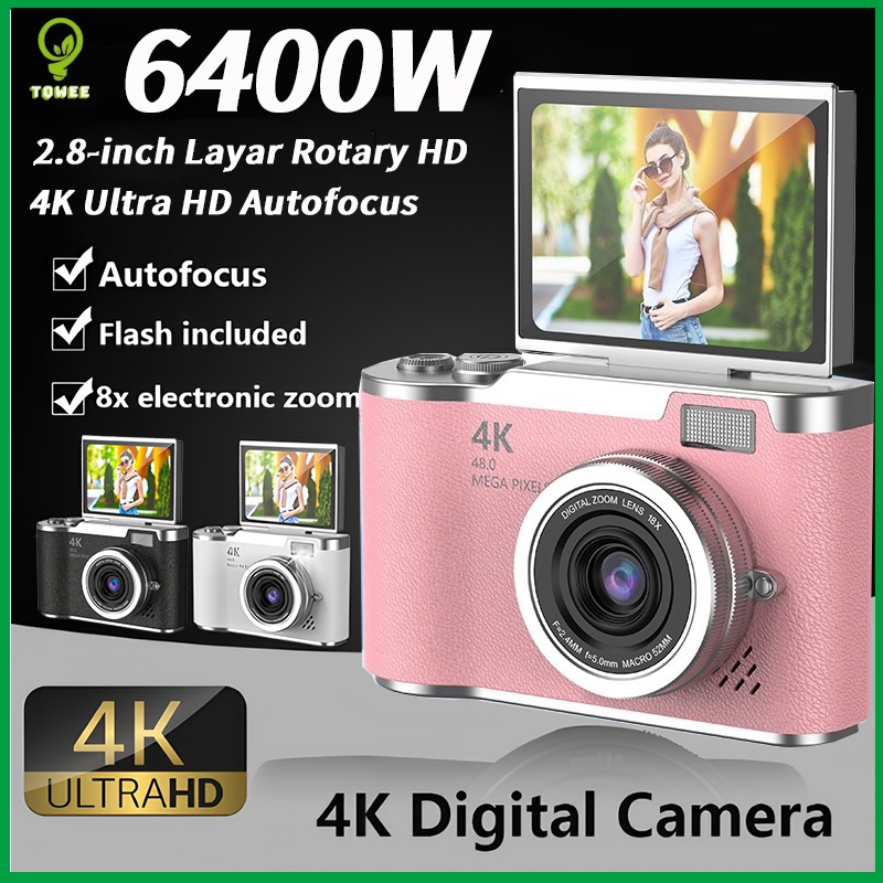 【Dengan kartu 64G】64/75MP 4K 8X Zoom Digital Kamera Digital Kompak Kamera Swafoto Layar Lipat 180° dengan Permainan Edukasi Kamera Digital Pelajar