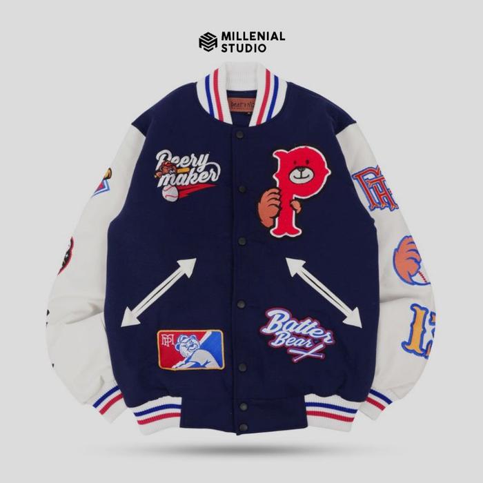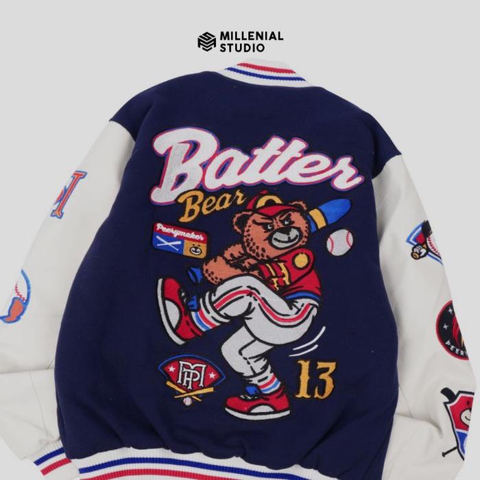 VARSITY JACKET BATTER BEAR NAVY WHITE FULL BORDIR ORIGINAL PEERY MAKER