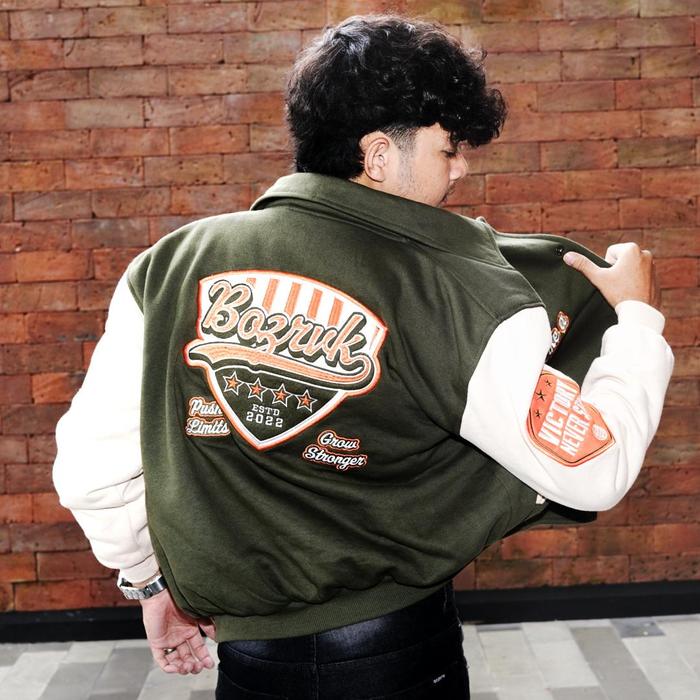 BOZRVK JAKET VARSITY PRIA WANITA CHAMPION HITAM & ARMY FULL BORDIR - HIJAU, L