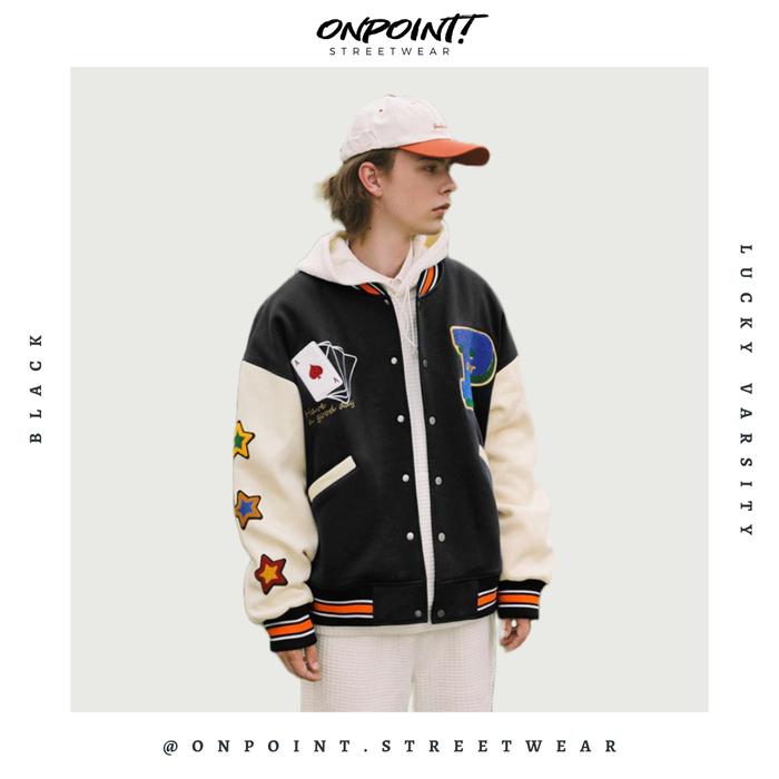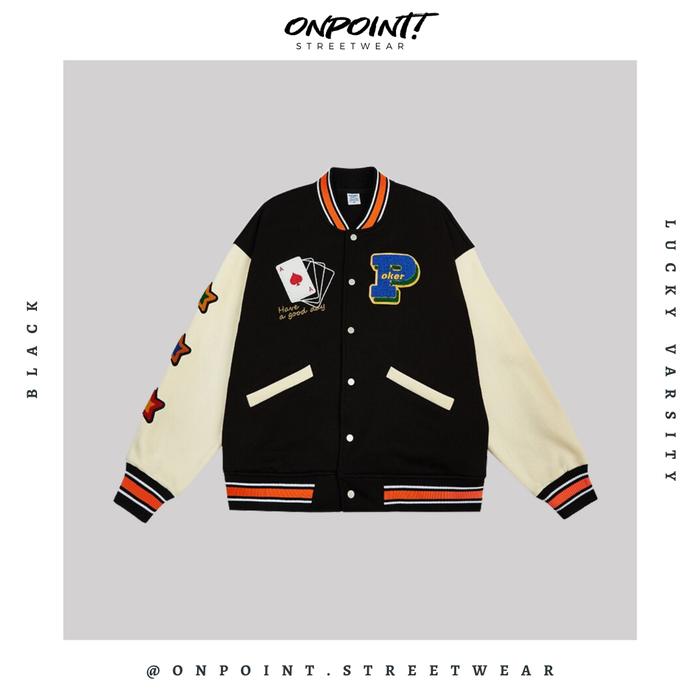 LUCKY VARSITY (BLACK) - JAKET PRIA JAKET VARSITY PRIA VARSITY JACKET VARISTY BASEBALL JAKET VARSITY ORIGINAL JAKET VARSITI ORI FASHION PRIA BAJU PRIA STREETWEAR JAKET KOREA PRIA - HITAM, S
