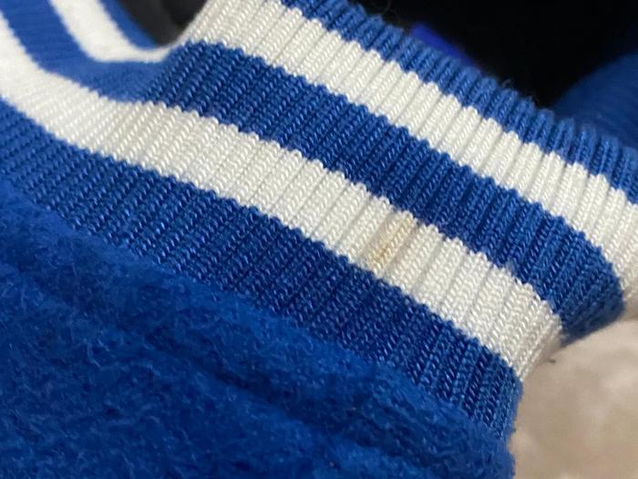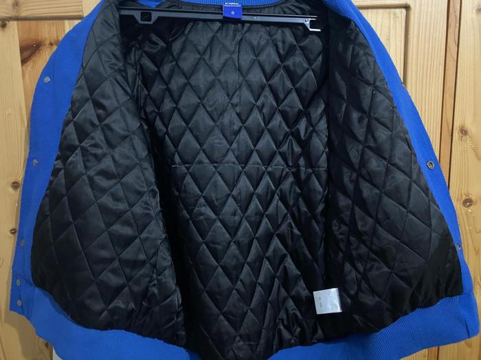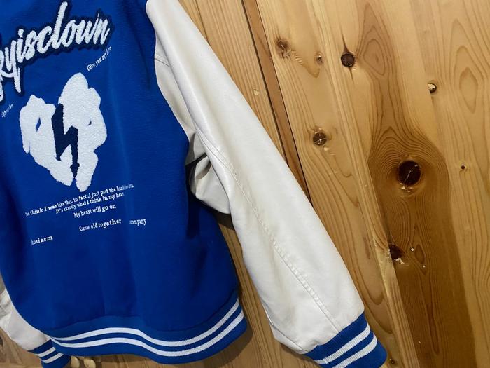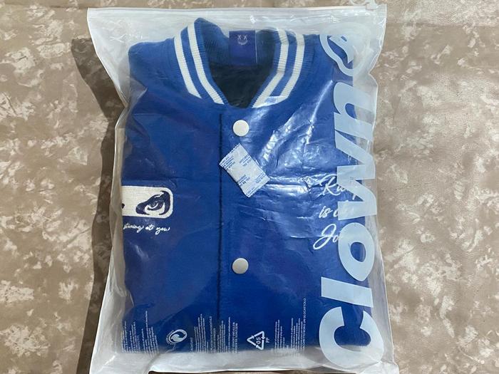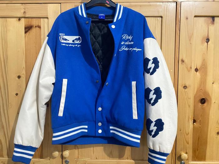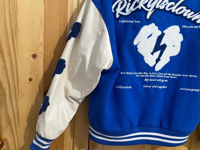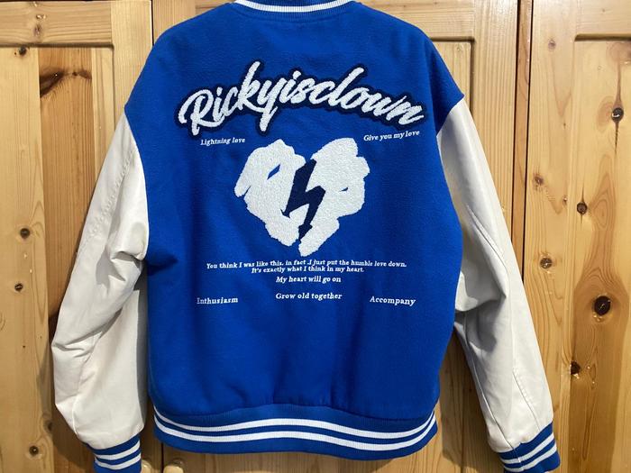 VARSITY JACKET OVERSIZED RICKY IS CLOWN SIZE S - JAKET VARSITY BIRU PUTIH OVERSIZED
