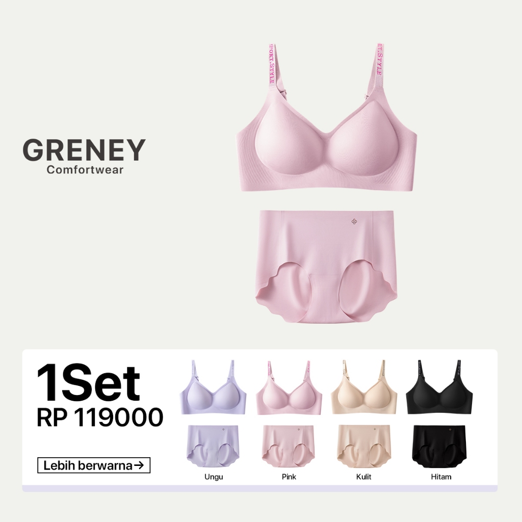 GRENEYBra Set Bra Seamless Mulus Menopang Tali bahu huruf mengkilap Cup yang dapat dilepas Mengumpul alami + CD Kelopak Bunga1 Set