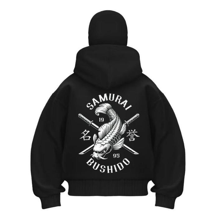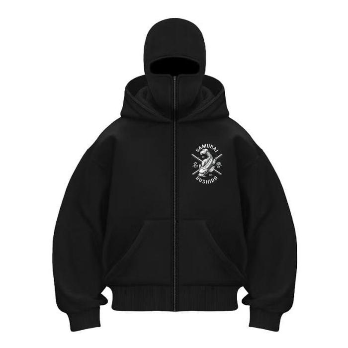 OUTWEAR GUDANG PAKAIAN NISA HOODIE BALACLAVA SAMURAI LOGO PUTIH ZIPPER JAKET HOODIE BOXY HITAM NINJA BALACLAVA PRIA DAN WANITA NYAMAN LEMBUT JUMPER - HITAM, S