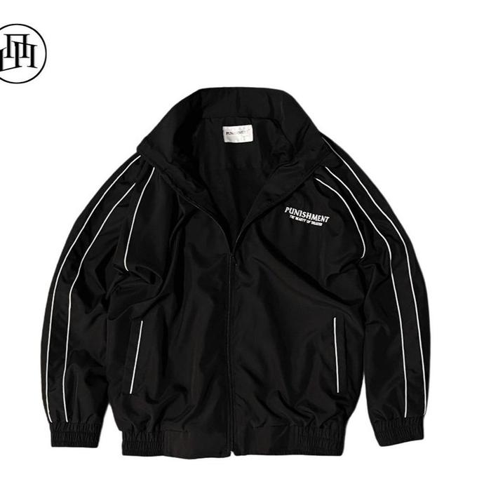 PUNISHMENT TRACKTOP JACKET BEZI BLACK OVERSIZE JAKET PARACHUTE DENGAN ROYAL NIL PRINTINK INK & YKK ZIPPER - SIZE M/L/XL - JACKET BEZI LOGO, M