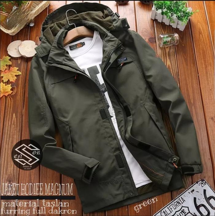 JAKET HOODIE MAGNUM PRIA / JAKET WATERPROOF / JAKET PARASUT TASLAND / JAKET OUTDOOR - HIJAU ARMY, M