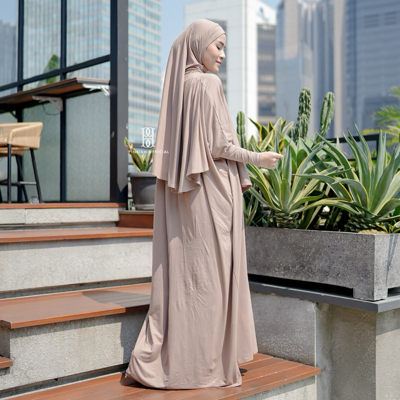 Pinkish Official Rania Set Dress Abaya + Hijab Instan Bahan Cotton Rayon Spandex Import Abaya Set Umroh dan Haji