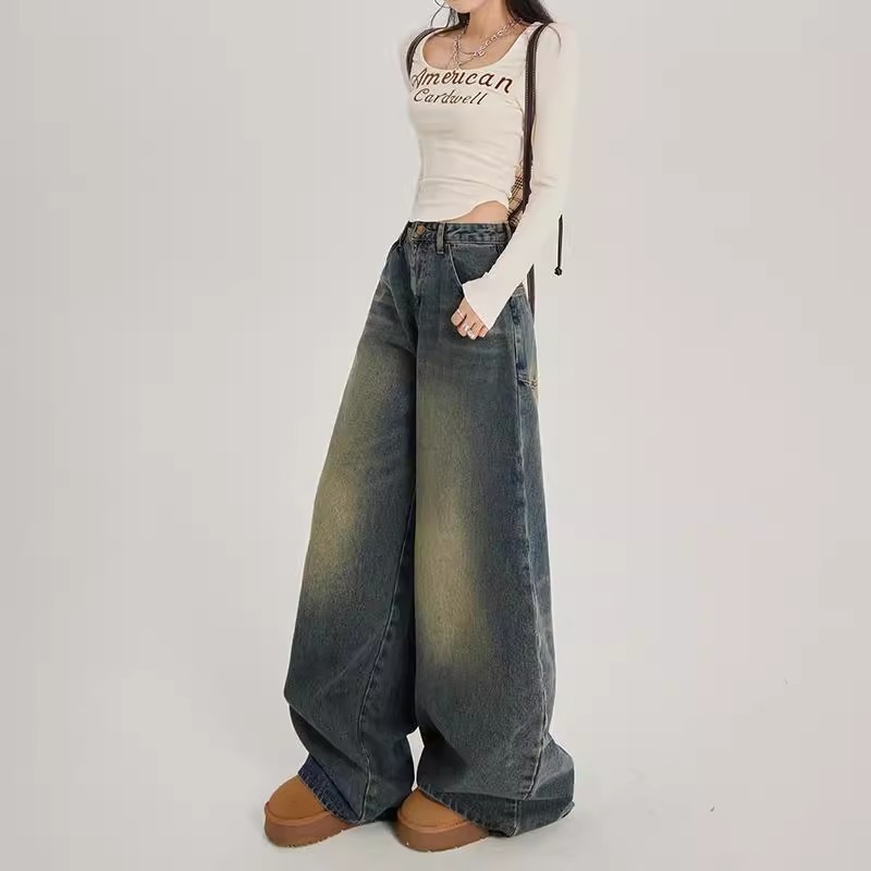Jumbo Size Baggy Jeans Wanita Pinggang Tinggi Jeans Retro Longgar Korean Celana Panjang Denim