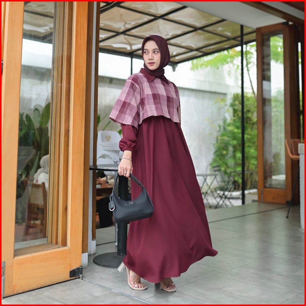 Proudyhijab - Yunabi Dress Outer Motif Kotak Kotak Dress Wanita Korean Style Lengan Balon Busui Friendly Bukaan Kanan Ki
