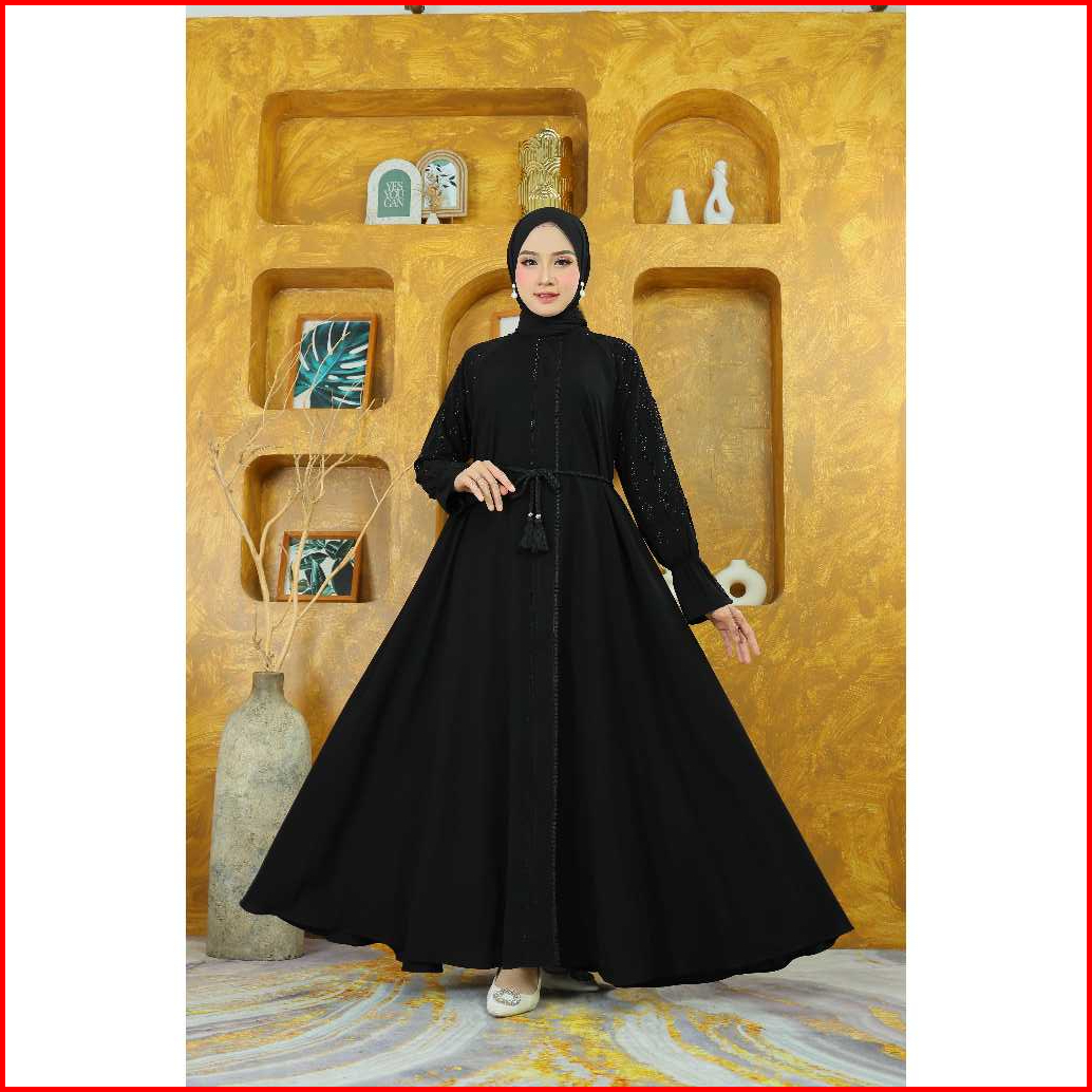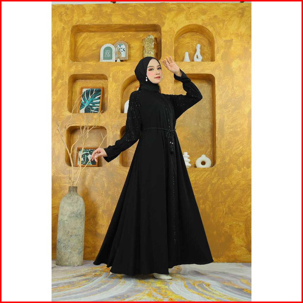 J Collection Gamis Abaya Dress Syari Viral Hitam Jet Black Lebar Resleting Depan Renda Swarovski