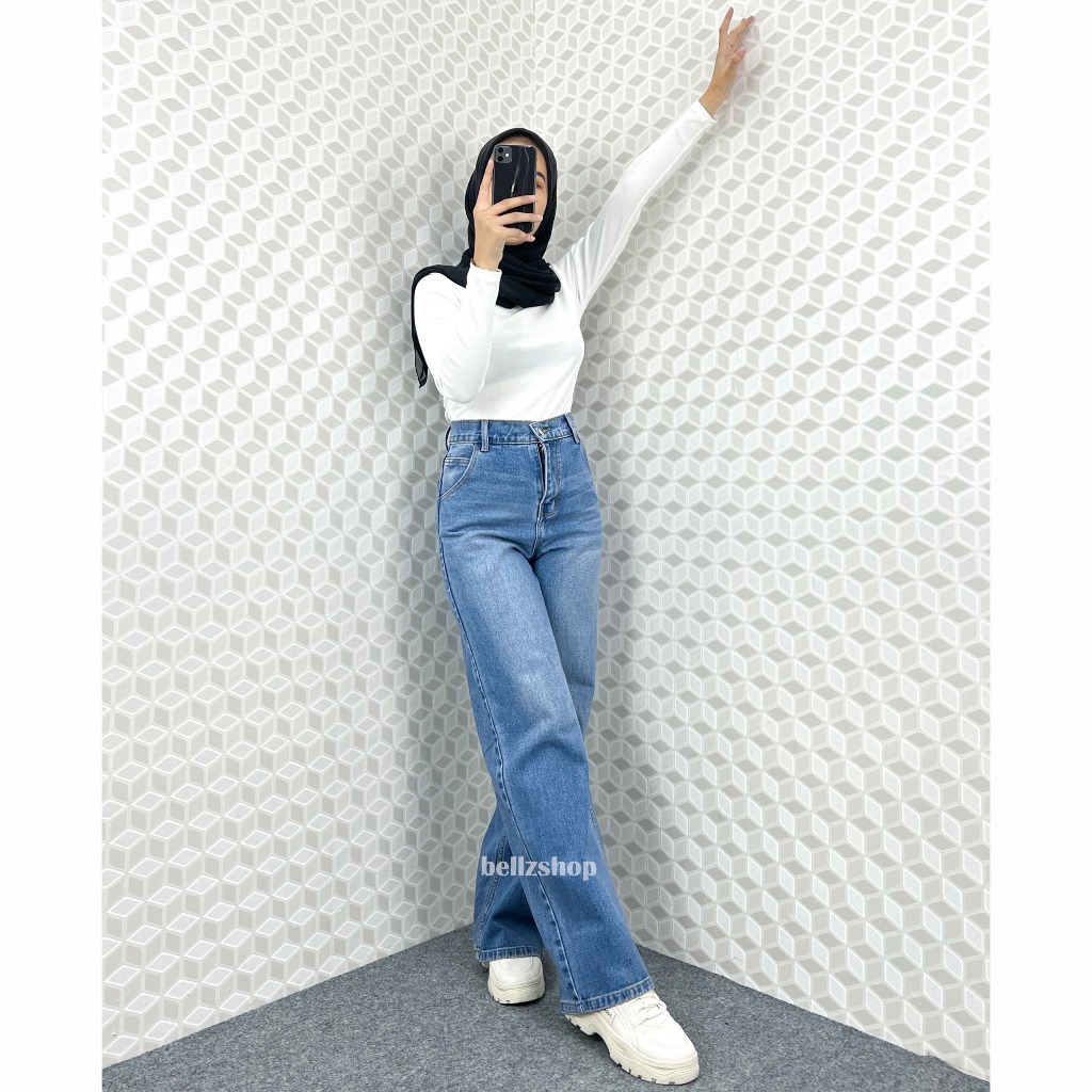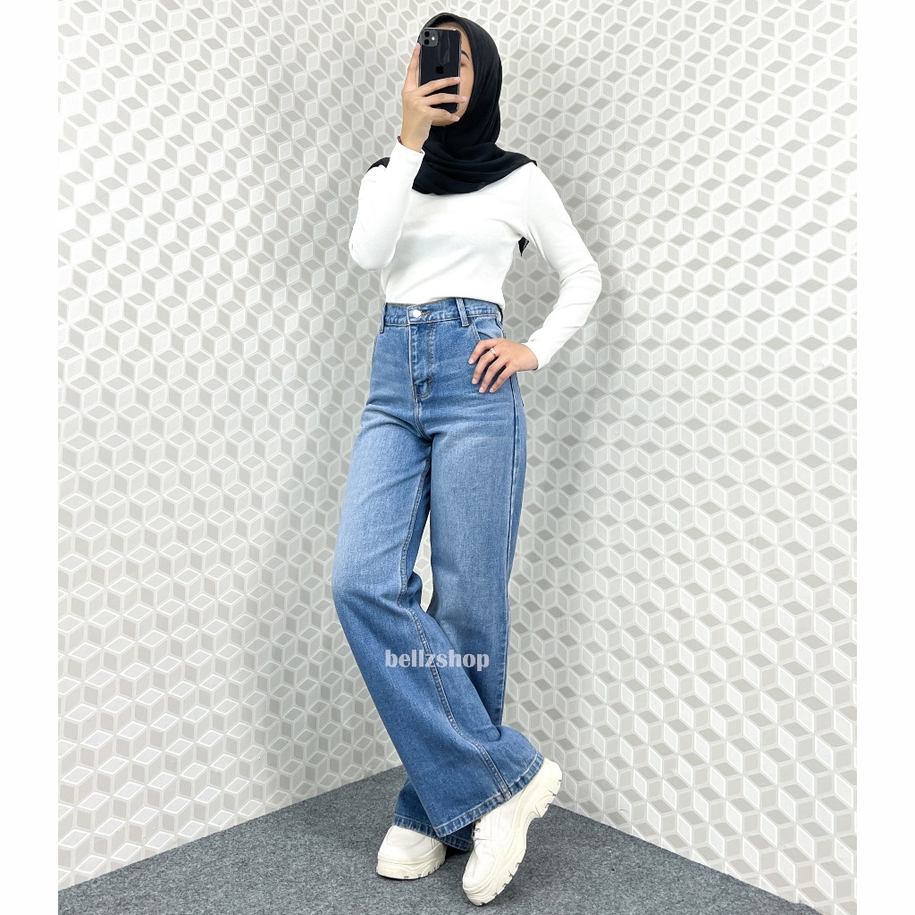 Celana Kulot Highwaist Jeans Panjang Wanita Tebal Tint Whisker Premium Bellzshop Sachi Size S-XXL