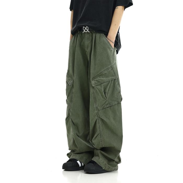 CELANA JEANS CARGO PANJANG UNI KOREAN STREET STYLE WASHED VINTAGE DETAIL STRUKTURAL LOOSE FIT BAHAN PREMIUM CASUAL - HIJAU, S