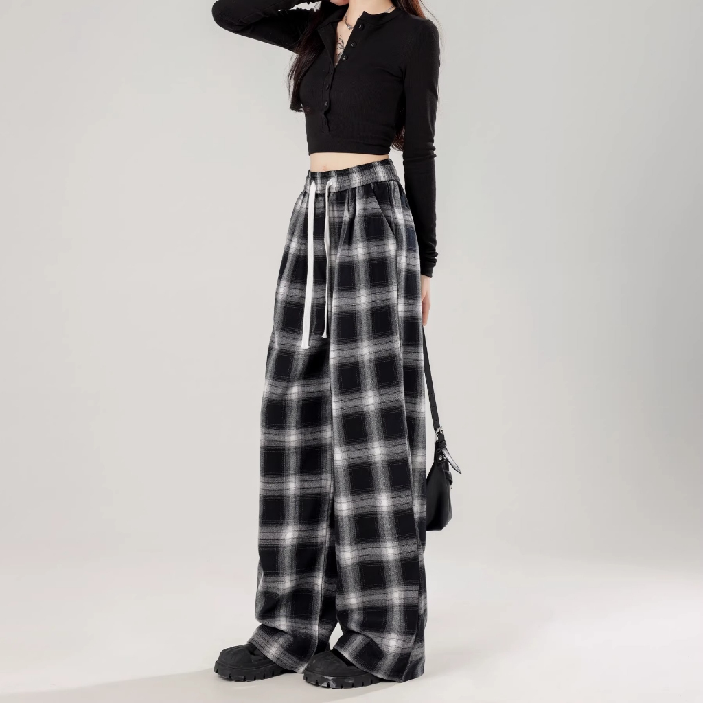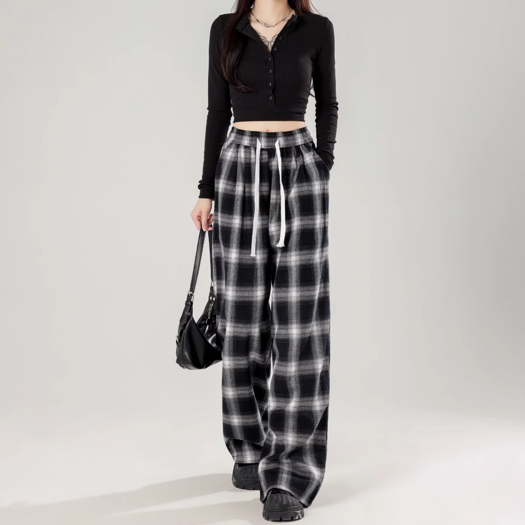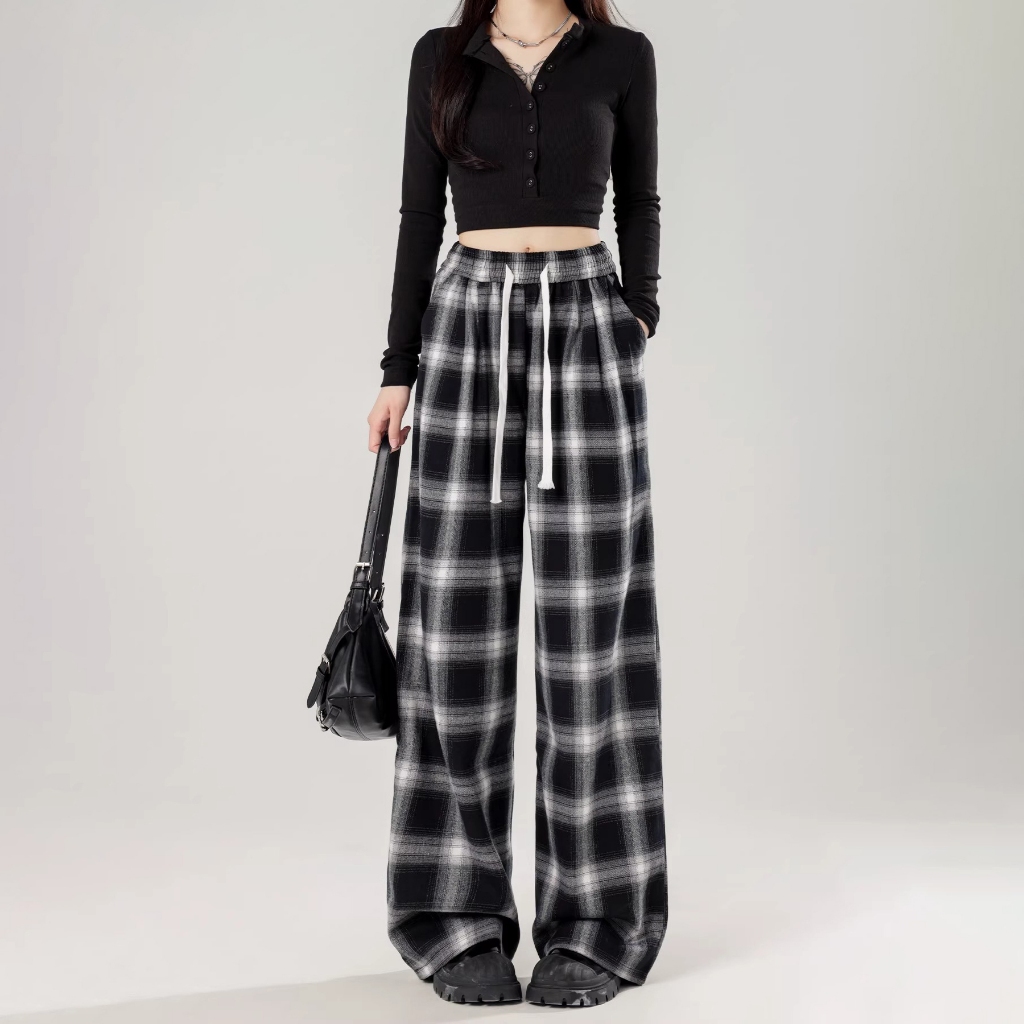 【Stok Siap】Celana Panjang Wanita Motif Kotak - kotak Casual Tartan Plaid Long Pants Korean Fashion
