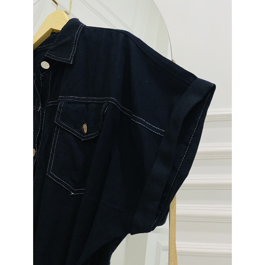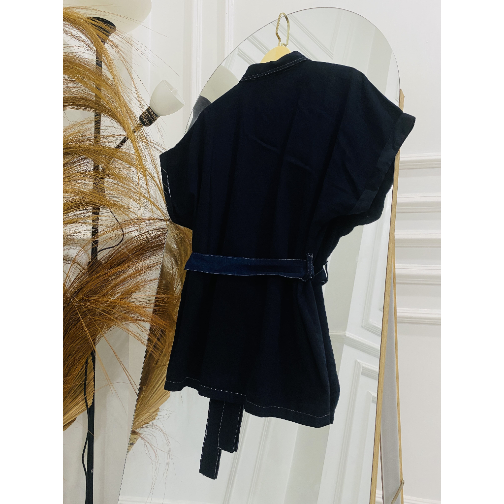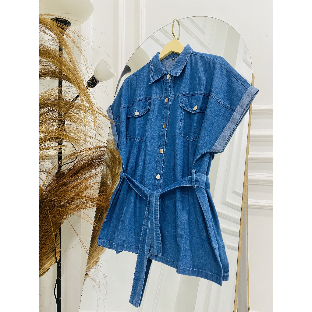 Meltz.id - Atasan Kemeja Jeans Oversize Lengan Pendek Wanita Dewasa Tali Pinggang