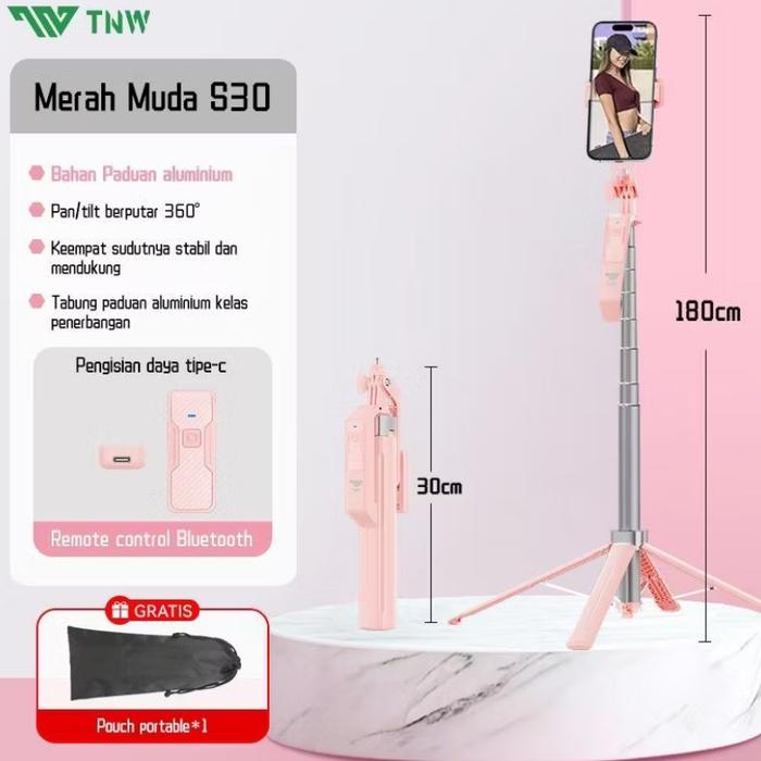 TNW S30 TONGSIS HP SELFIE STICK BLUETOOTH 4IN1 TONGSIS GIMBAL TRIPOD - TRIPOD+2LAMPU, CREAMY PINK