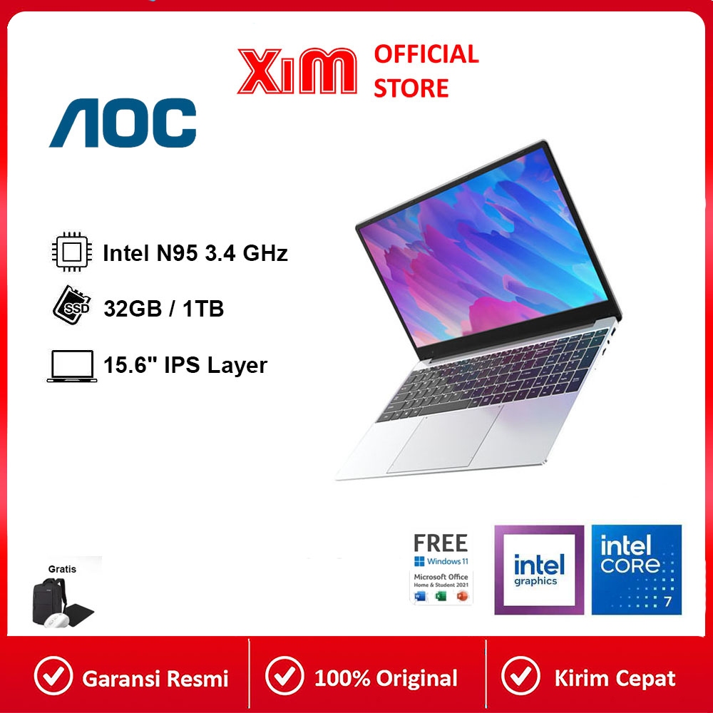 Xim PC AOC Laptop 15.6" Intel Core N95 Terbaru 2024 untuk Kantor, Game, dan Penggunaan Rumah - Desain Ringan, Portabel,
