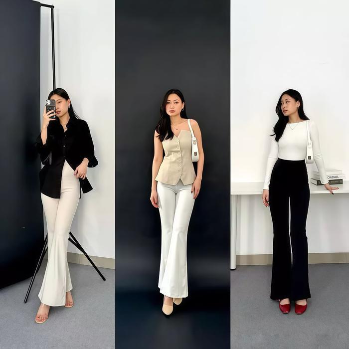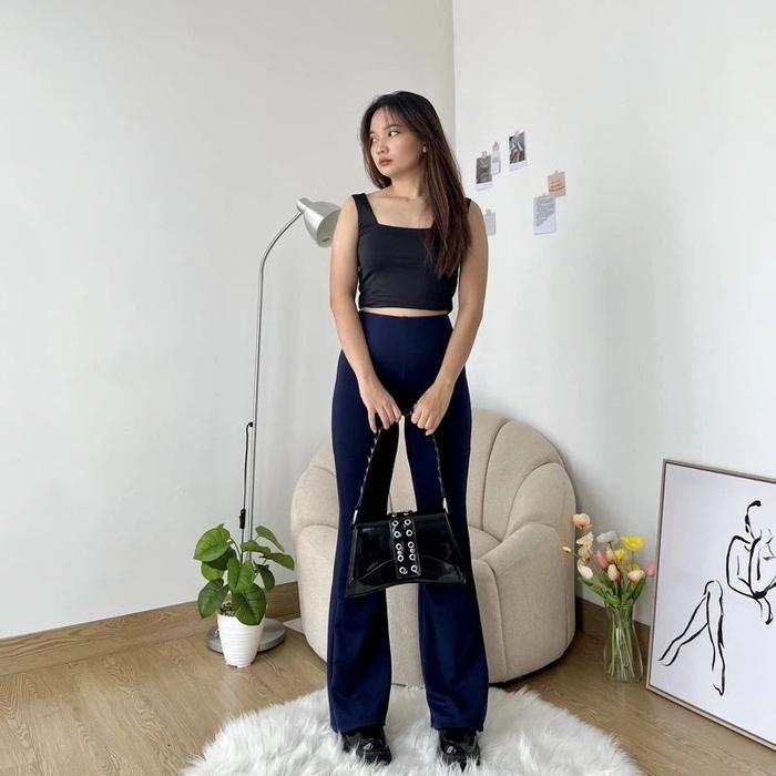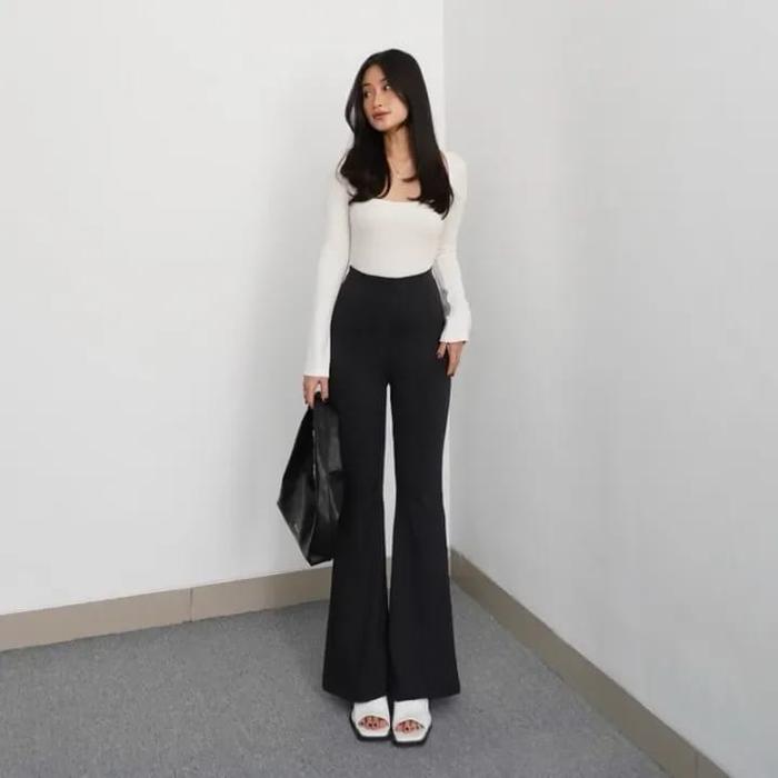 Flare Panst Highwaist Cutbray Celana Panjang Wanita Semi Kulot Pant Bawahan Hitam Casual - Hitam Knit, M