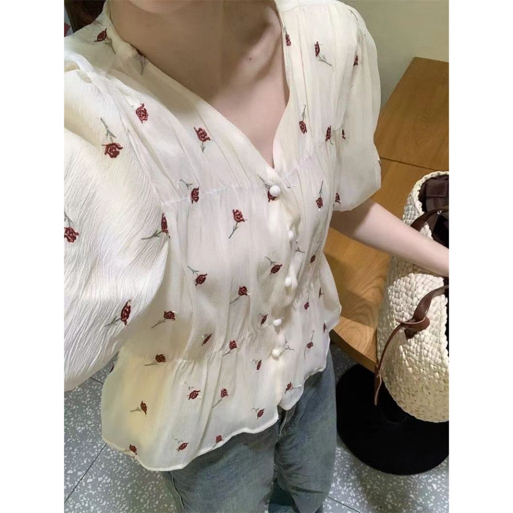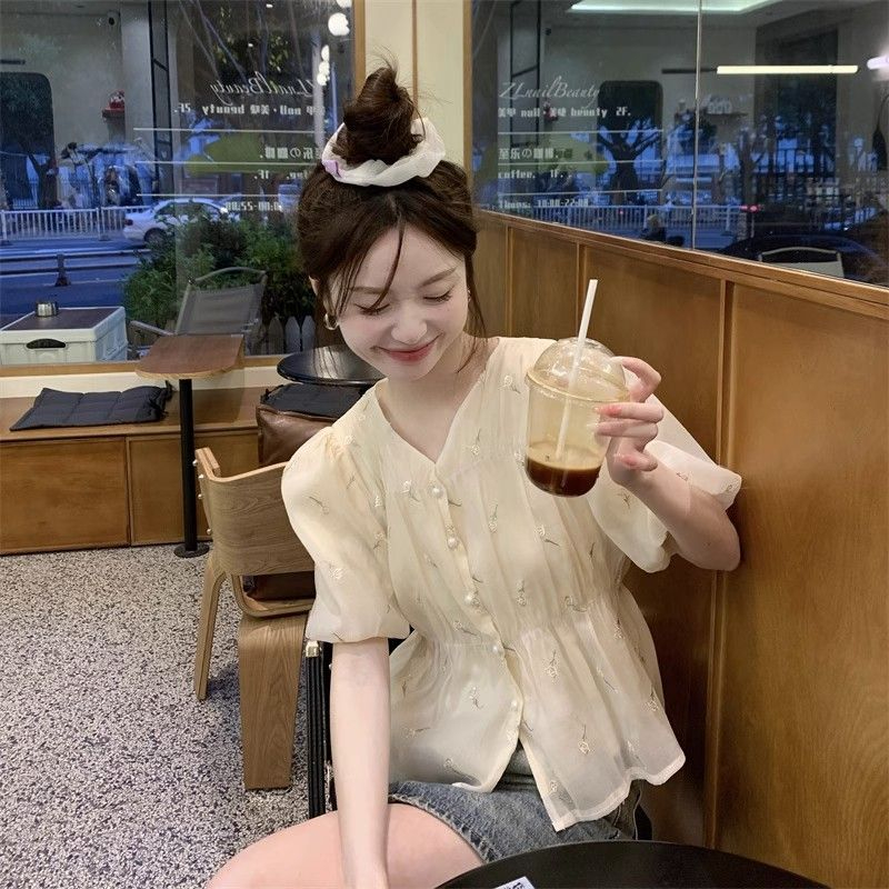 Kemeja Korea Shirt Shifon Blus / Casual Sifon Blouse Wanita Atasan / Gaya Istana Bordir Pinggang Lentera Lengan Kemeja