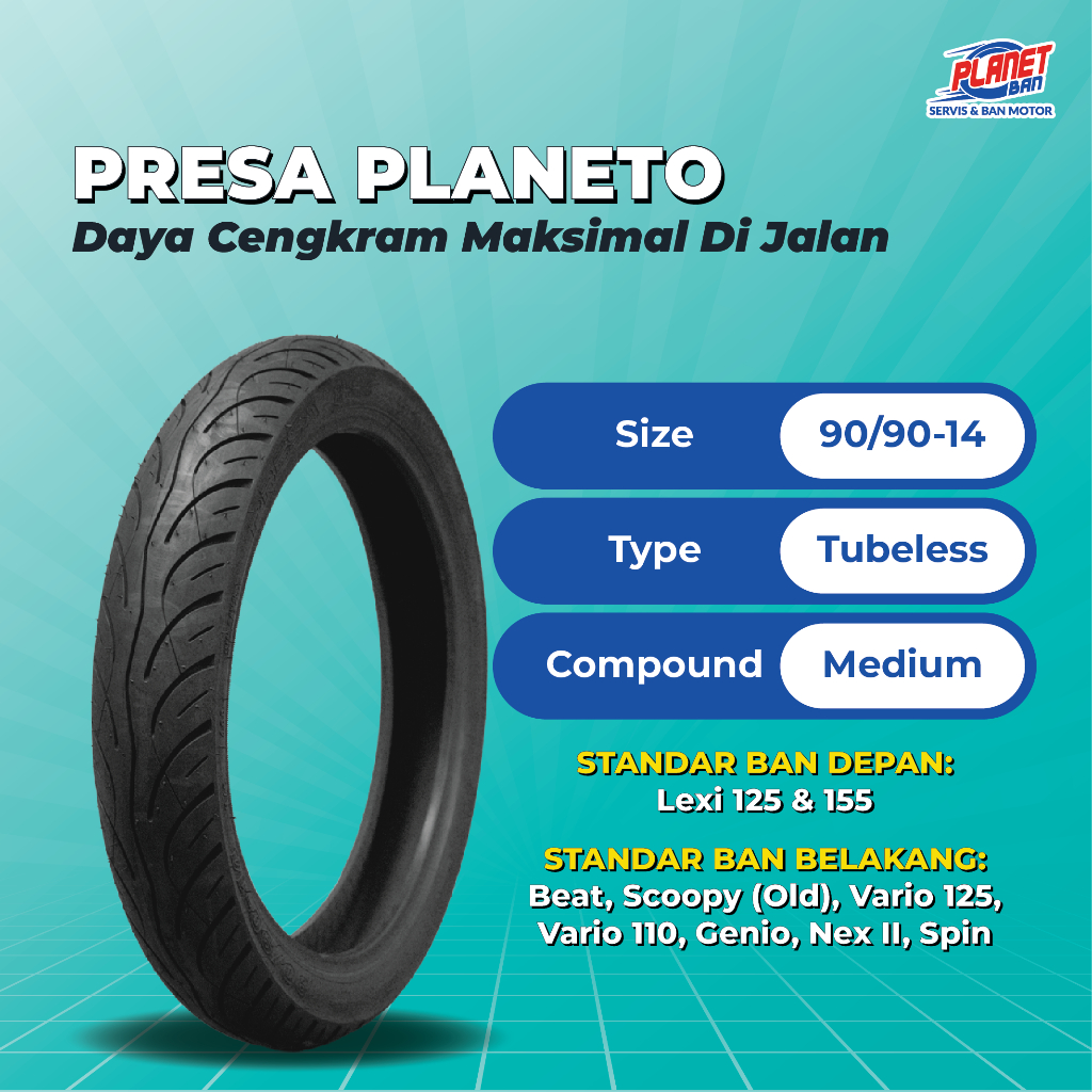 Ban Motor Ring 14 - 90/90 Presa Planeto TUBELESS (Ban Motor Lexi 125, Lexi 155, Beat, Scoopy (Old), Genio, Vario 125, Vario 110)