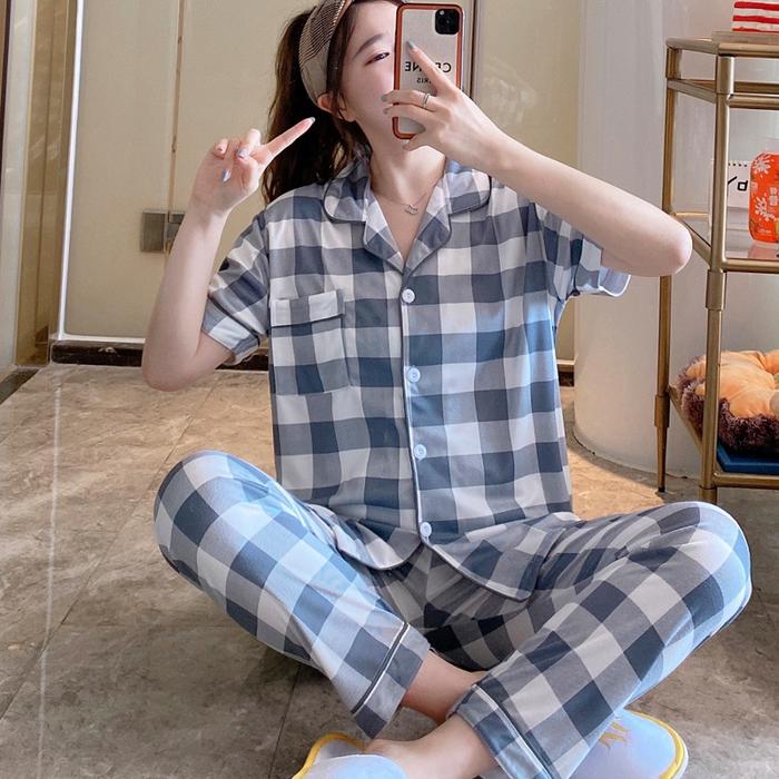 La Survie Baju Tidur Wanita Dewasa Piyama Set Kekinian Model Kemeja CP Seri Kotak - Kotak Abu Besar L