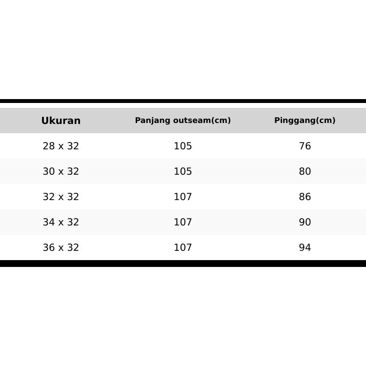 28 x 32, 30 x 32, 32 x 32, 34 x 32, 36 x 32, 30 x 30, 32 x 30, 34 x 30, 38 x 32