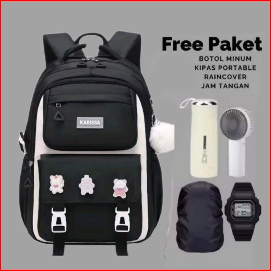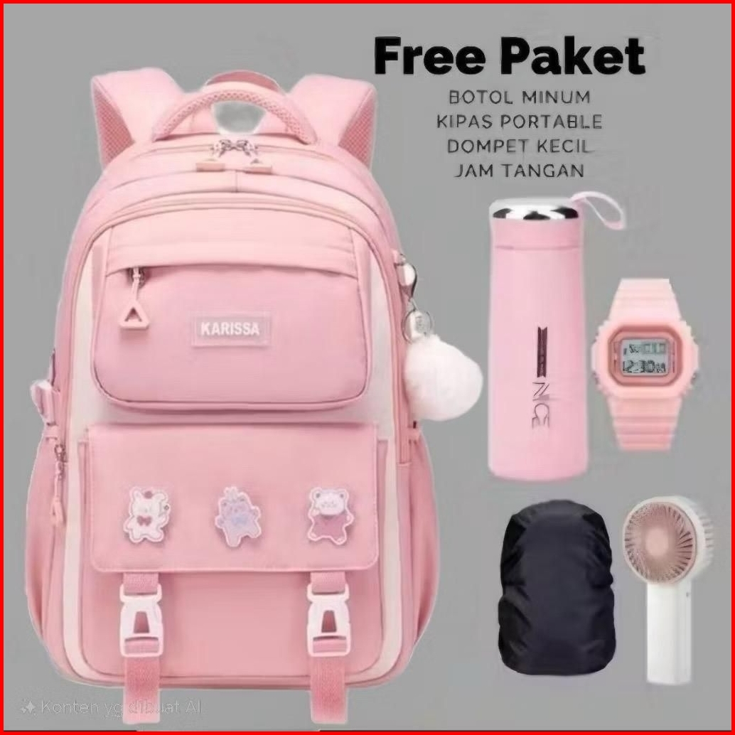 Tas Ransel 5in1 Kharissa Ransel Anak Sekolah Perempuan Sd Smp Sma Free Botol Minum Jam Raincover Kipas