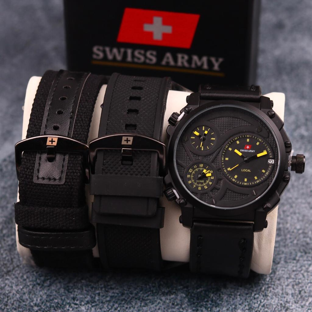 Jam Tangan Pria Swiss Infantry Paket Kulit Leather Triple Time On Tanggal Aktif Include Box Original Bonus Tali Kanvas &