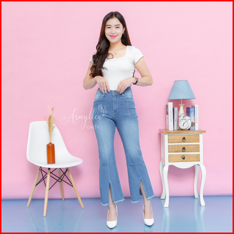 Celana Jeans Cutbray Wanita Highwaist Jeans Rawis Belah Tengah Stretch Mulur Size 27 - 34 Jumbo