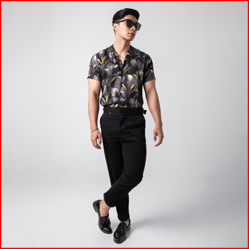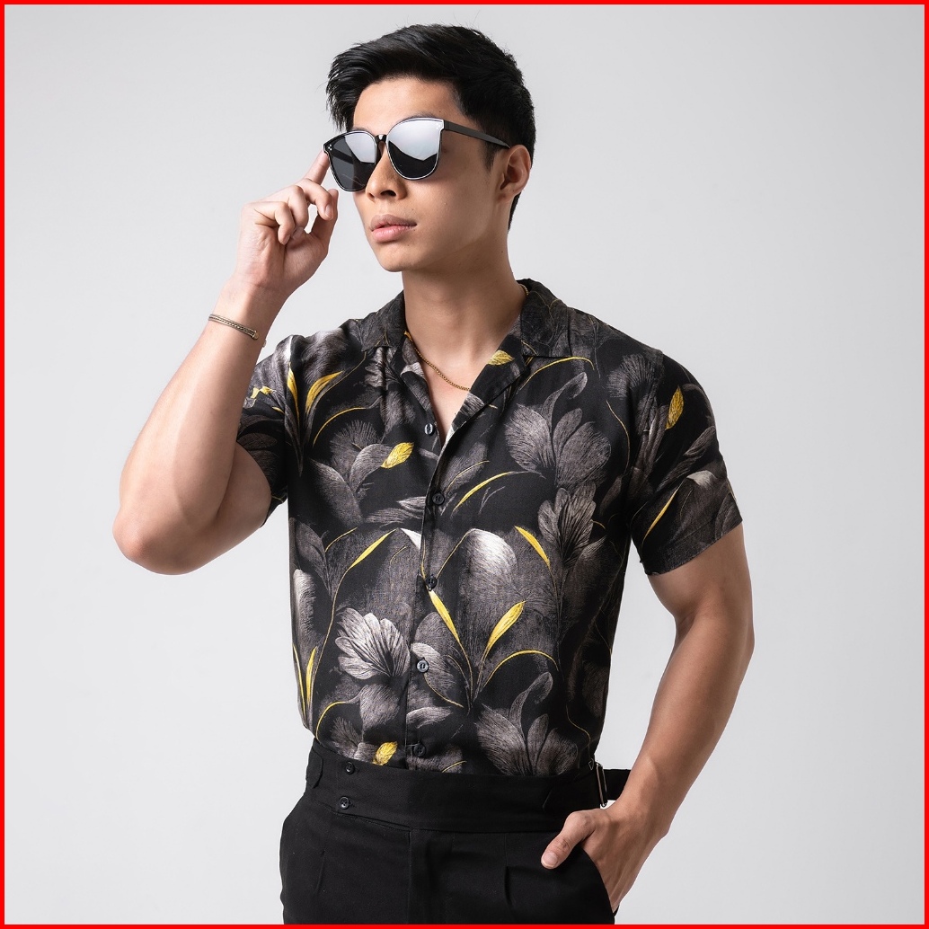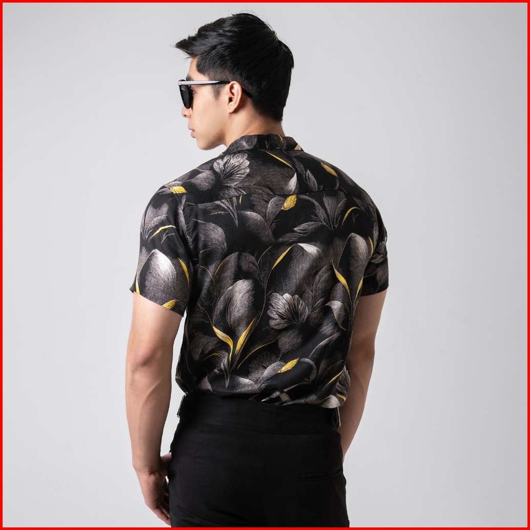 Vengoz Atasan Kemeja Pria Hawai Printing Slim Fit - Black Magnolia Casual Shirt Ss