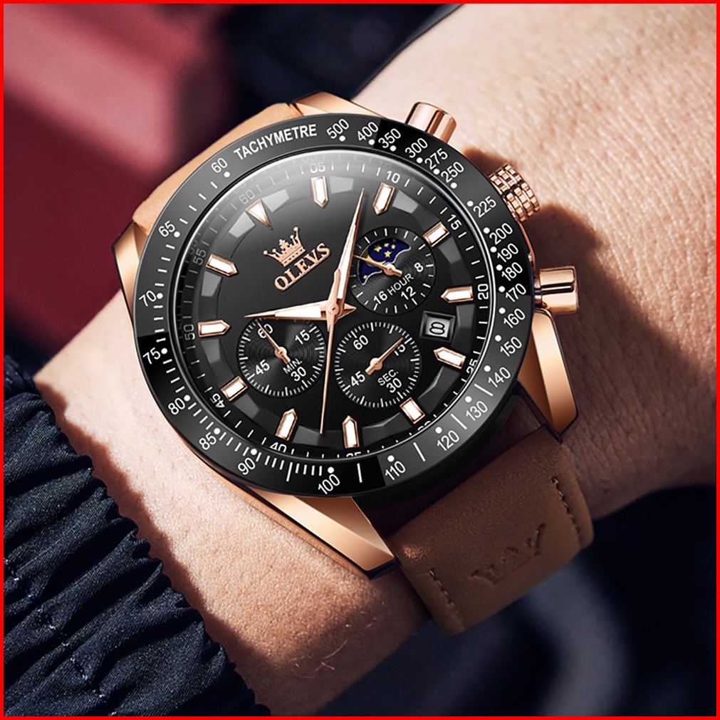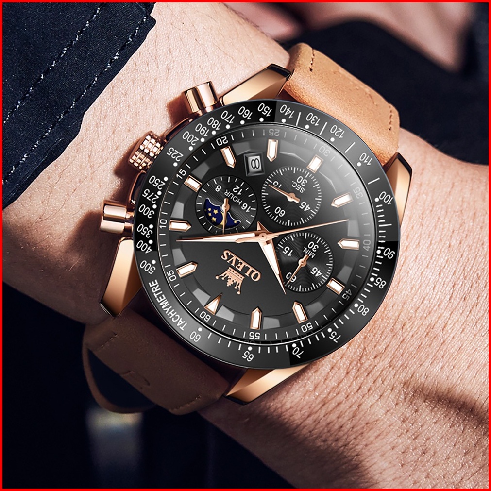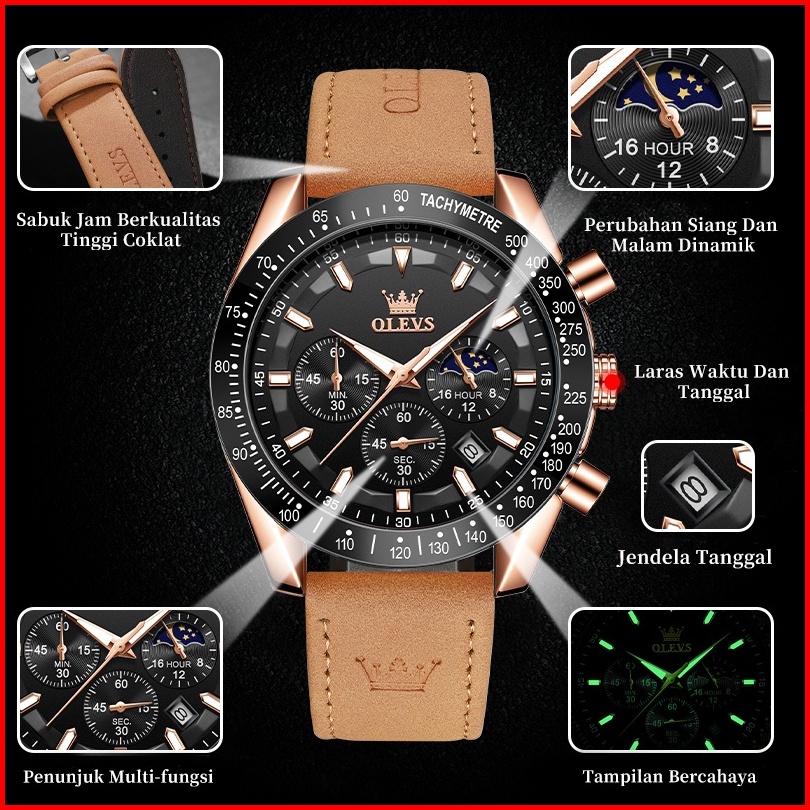 Olevs Jam Tangan Pria Original Anti Air Kulit Tahan Keren Led Hitam Luxury Chronograph Watch Men Multifungsi Model 9957