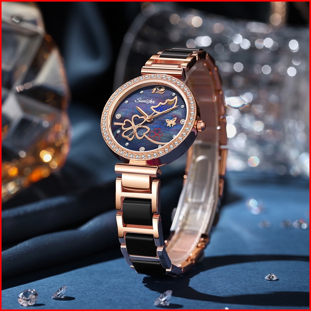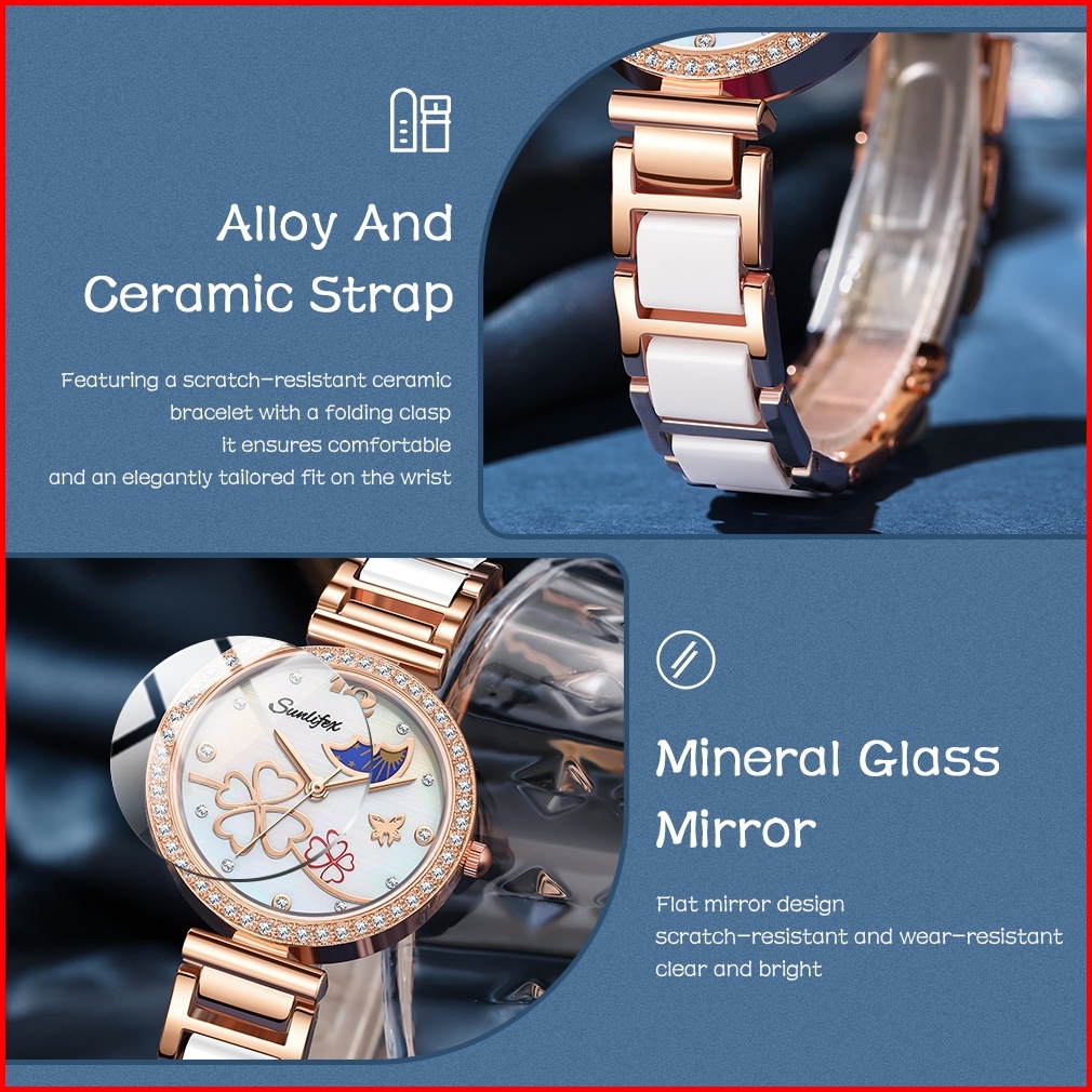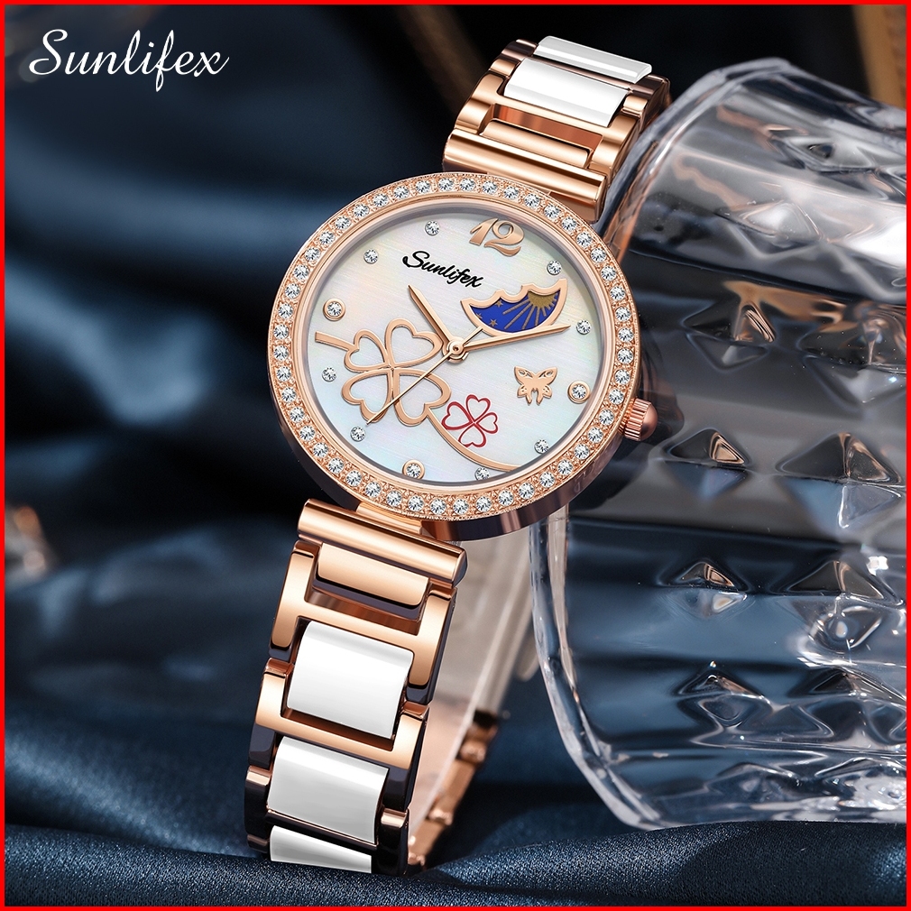 Sunlifex Jam Tangan Wanita Original 6033 Kuarsa Elegan Berlian Kasual Tali Keramik Jam Tangan Cewek