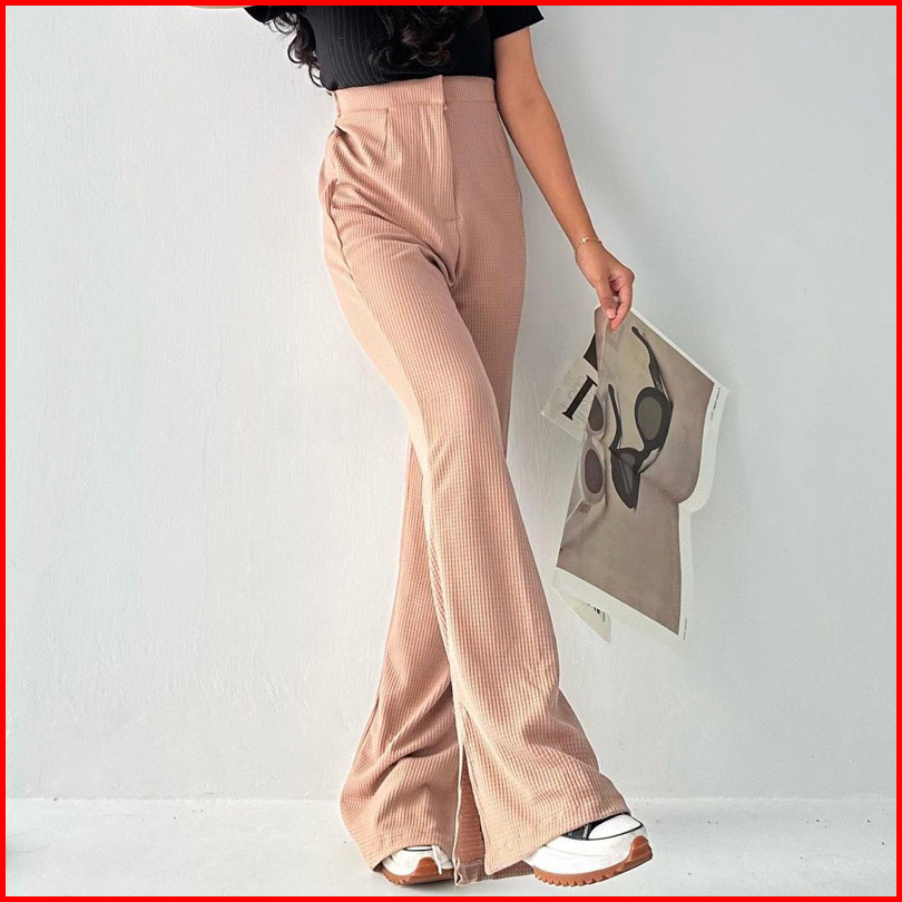 Celana Knit Waffle Slit - Celana Kulot Knit Rib Panjang - Knit Pants - Loose Pants Highwaist Kulot Panjang Basic Strech