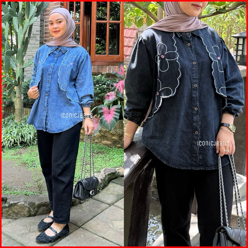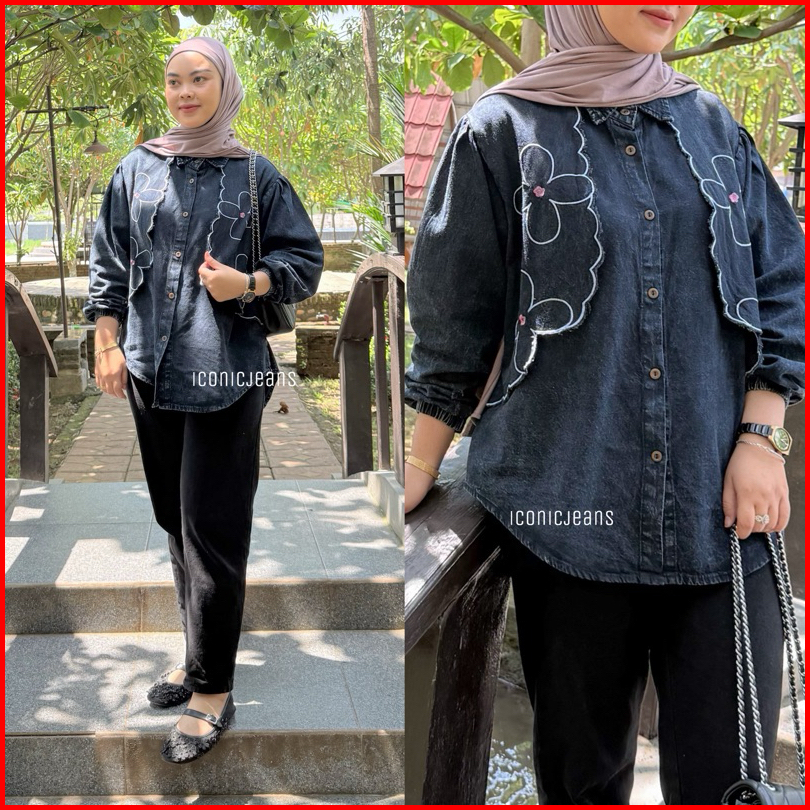 Iconicjeans - Kemeja Vest Jeans Bordir Lengan Karet Balon Full Kancing Busui Kemeja Jeans Kombinasi Rompi