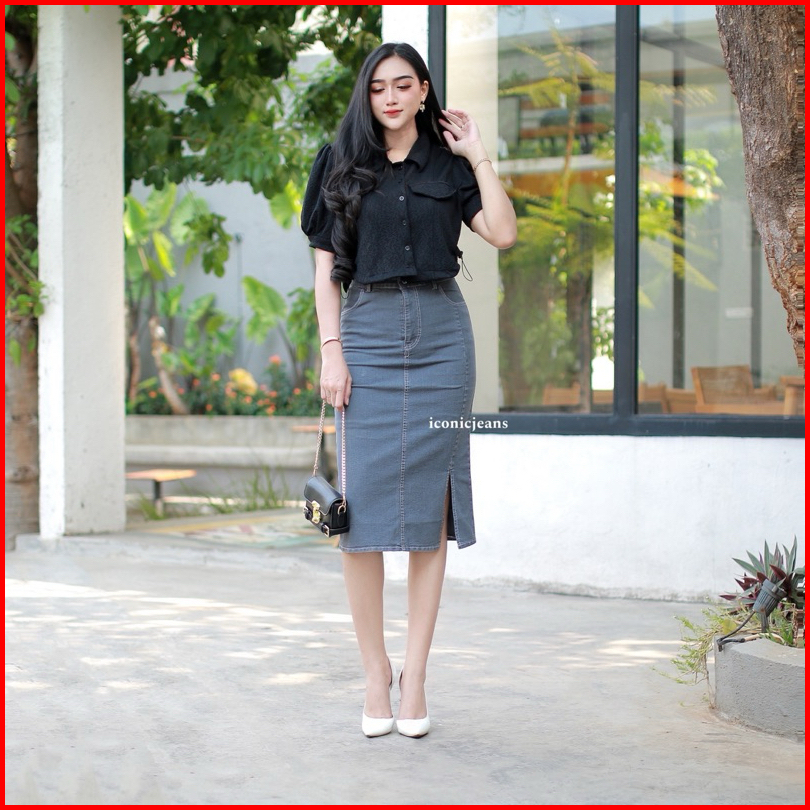 Iconicjeans - Nycta Jeans Skirt Rok Jeans Highwaist Stretch Pendek Belah Samping Pinggang Karet