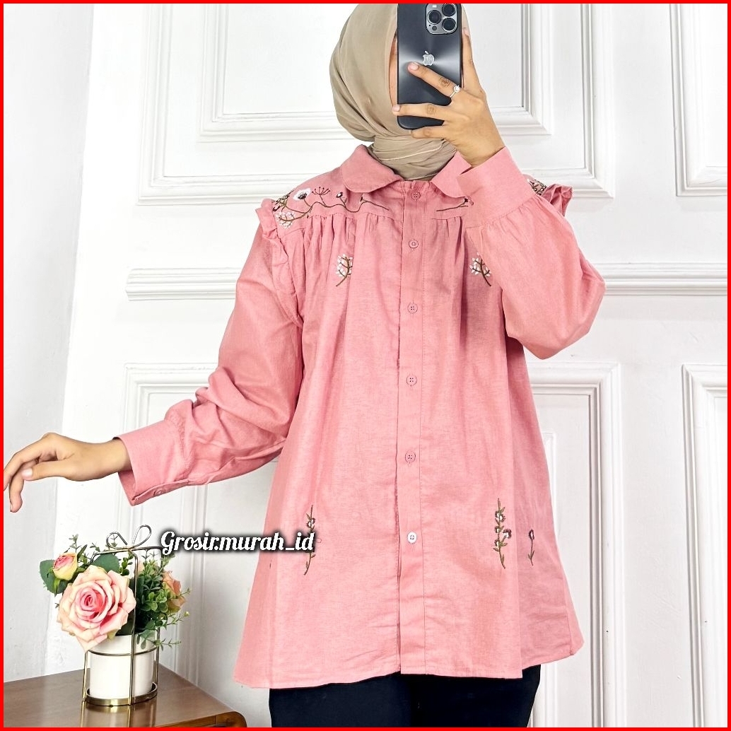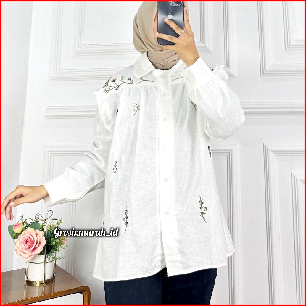 Gibrella Blouse Bordir Linen Rami Berkerah Bunga-bunga