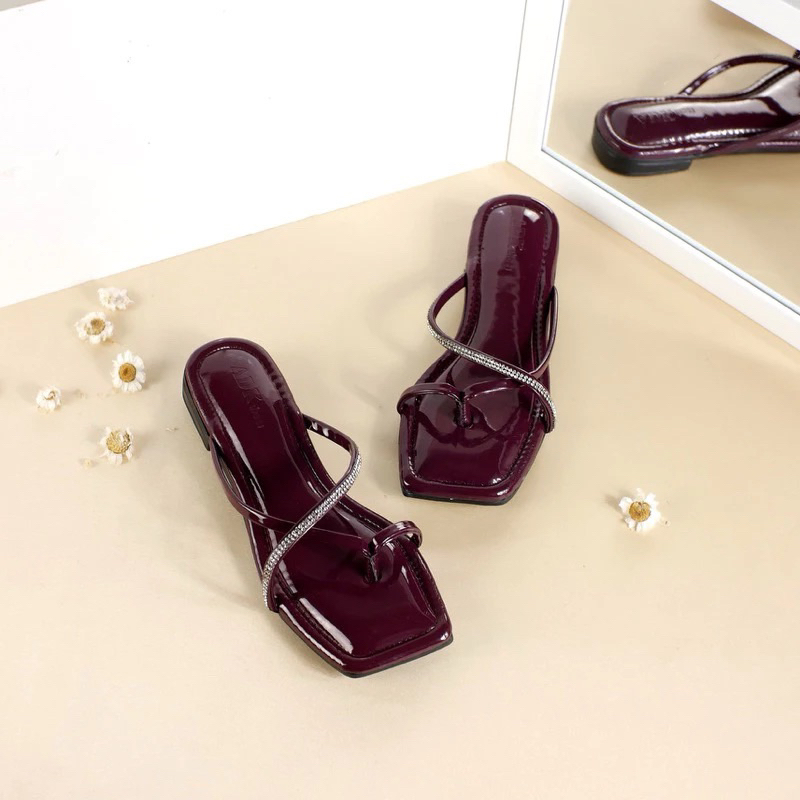 PROMO Sandal Naura Terbaru di 2025 Sandal burgundy MALVIE hiasan jelly permata Jepit jempol satu Flat Slop