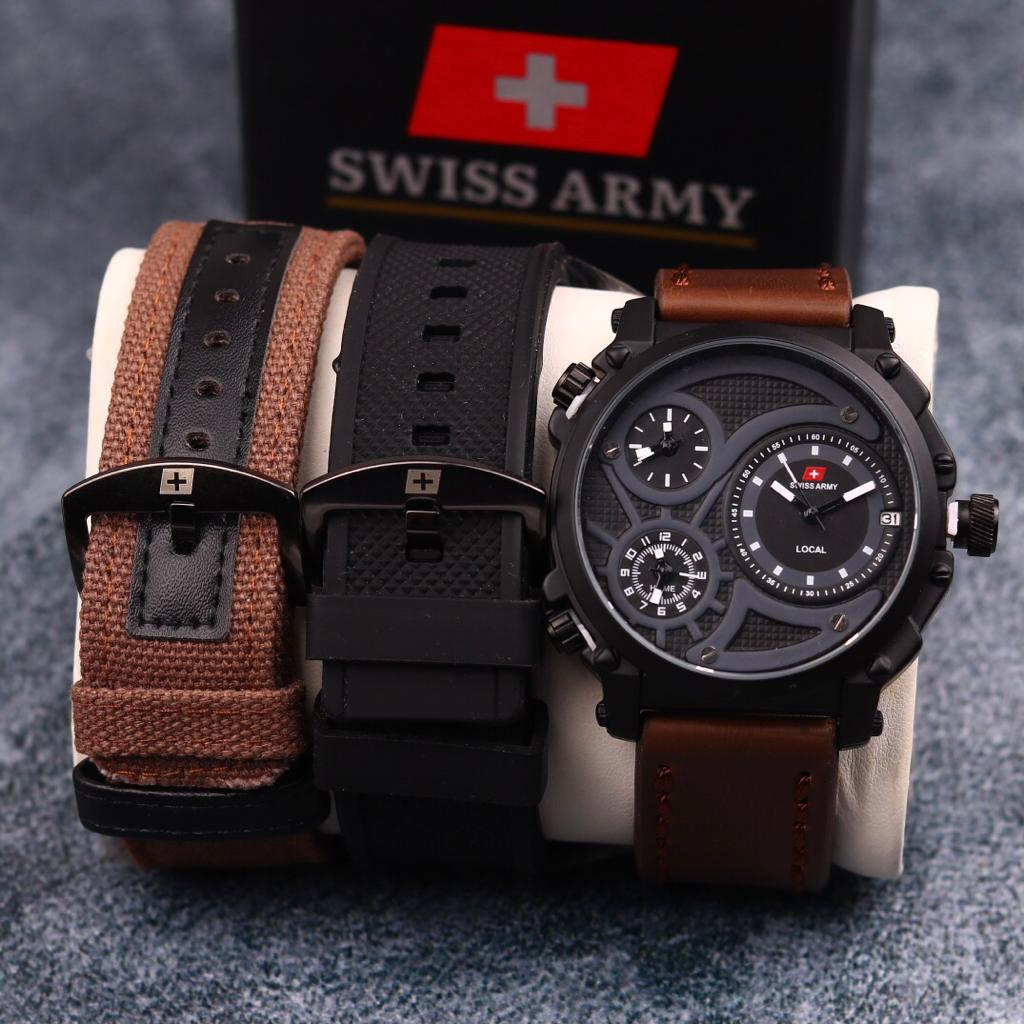 Jam Tangan Pria Swiss Infantry Paket Kulit Leather Triple Time On Tanggal Aktif Include Box Original Bonus Tali Kanvas &