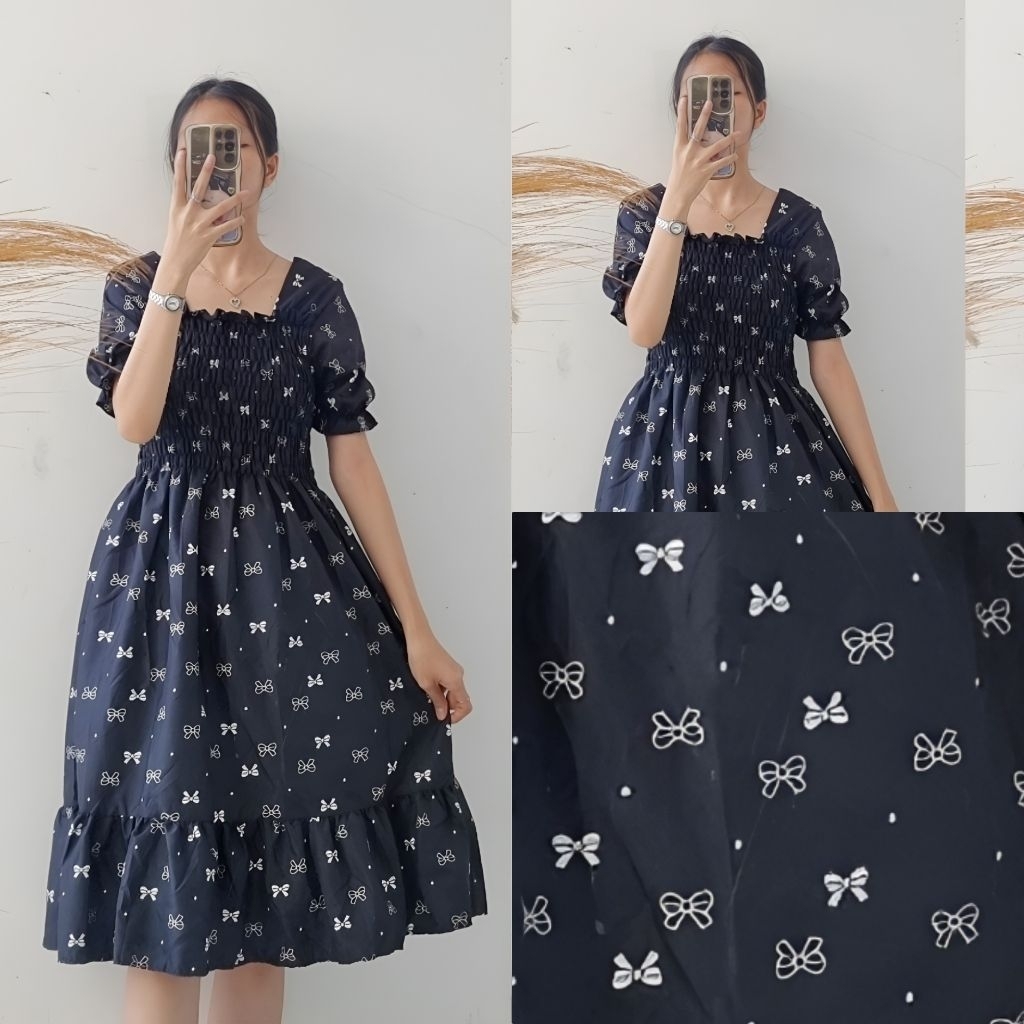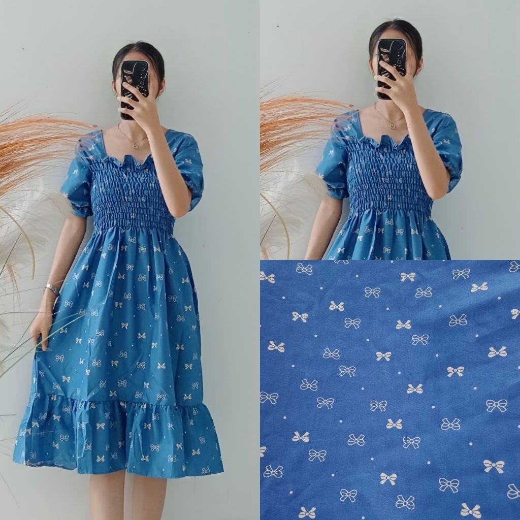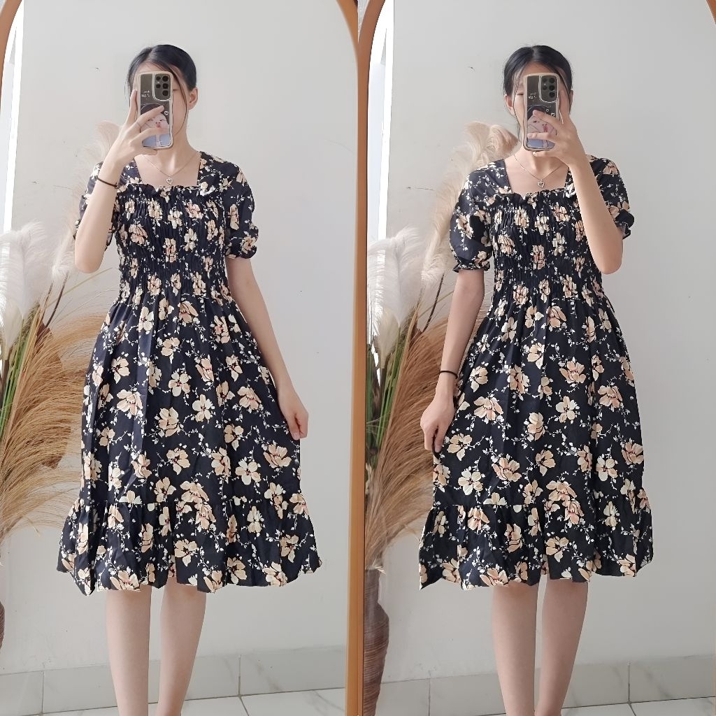 Gaun Kasual Bunga-Bunga Katun GG-Smocked Dress