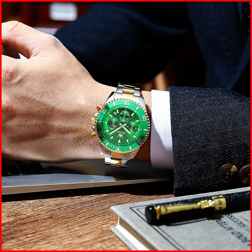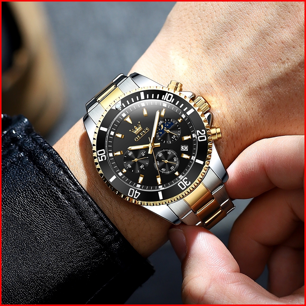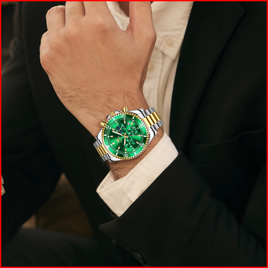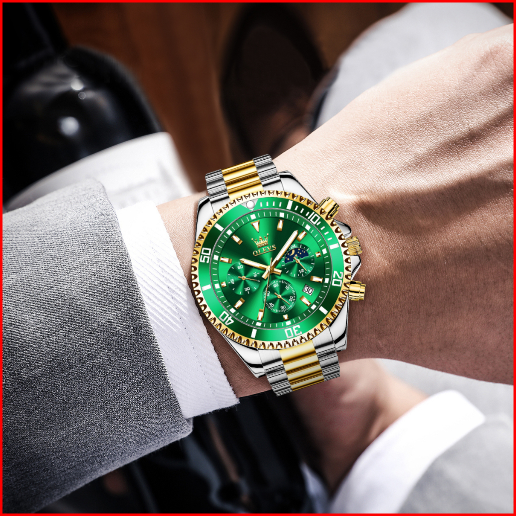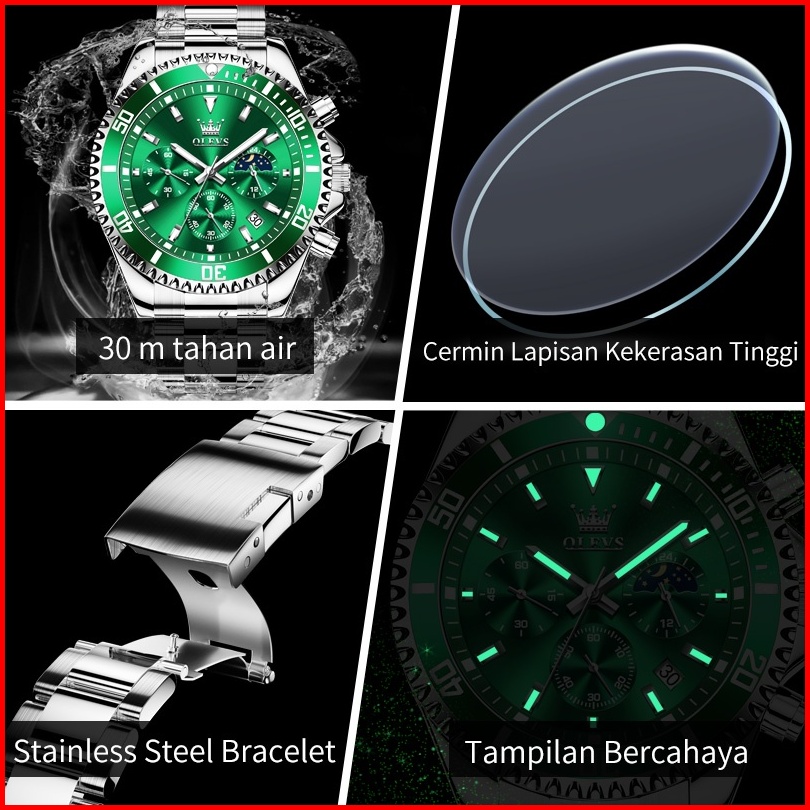Olevs Jam Tangan Pria Anti Air Original Keren Luxury Led Analog Stainless Steel Chronograph Watch Men Hijau Hitam Biru
